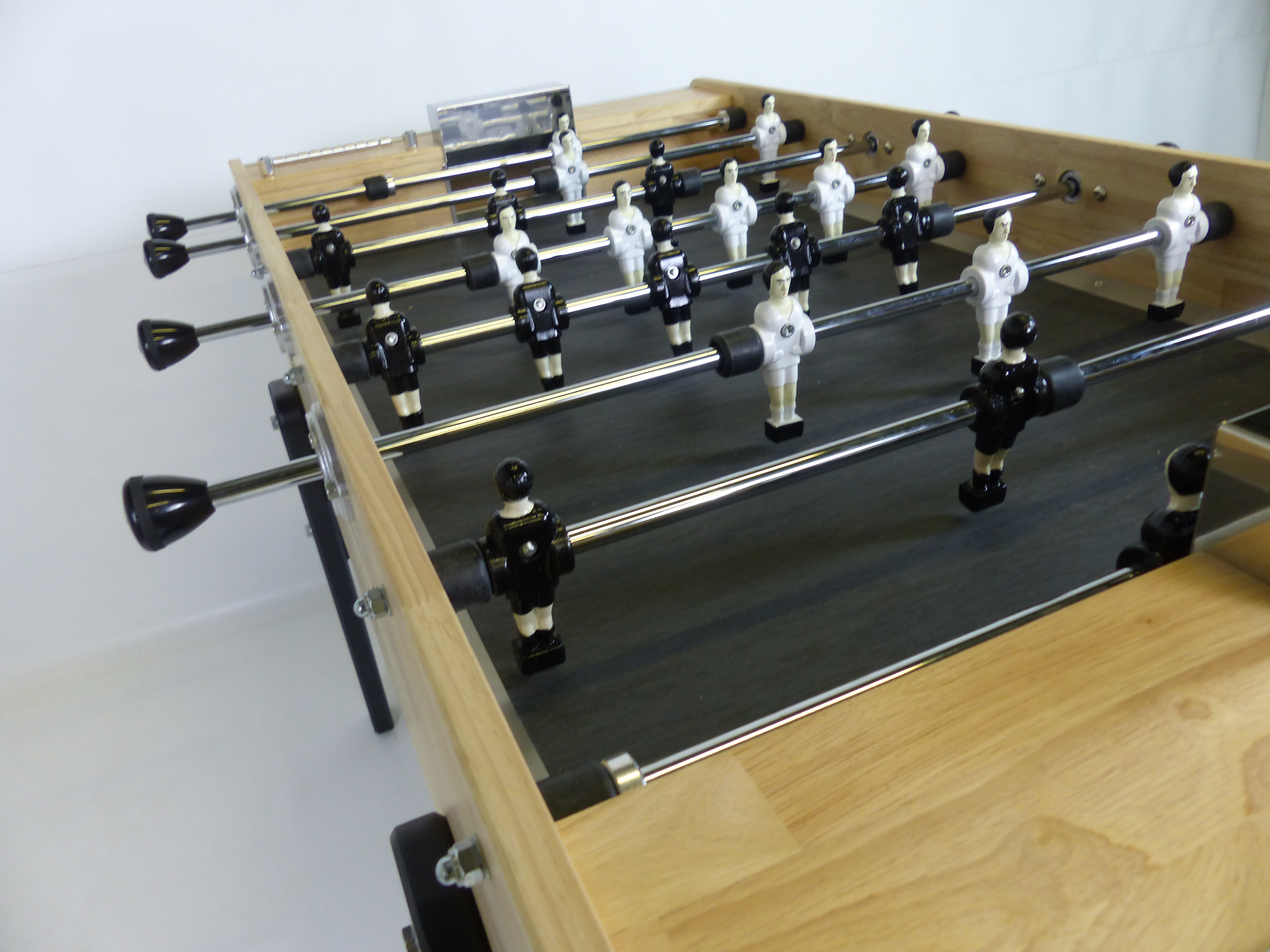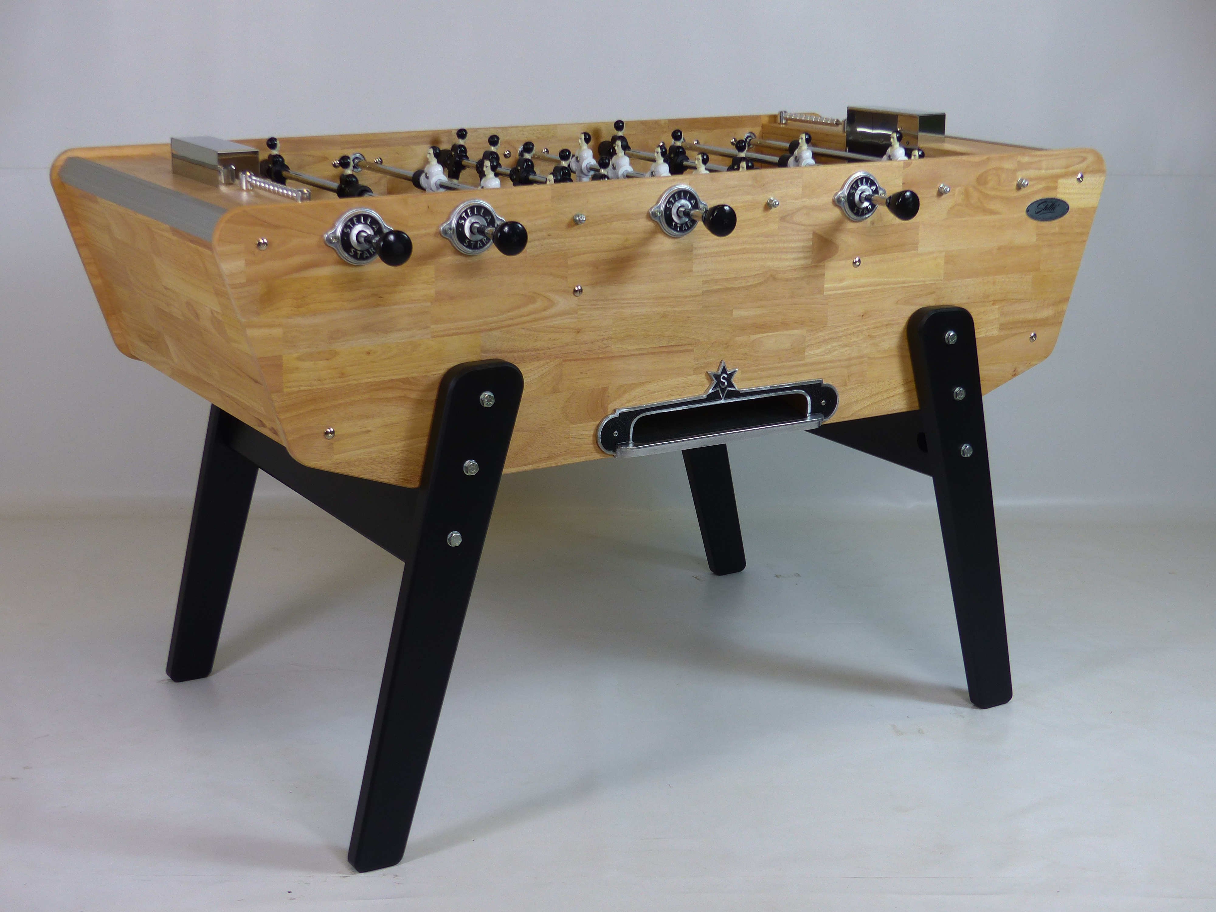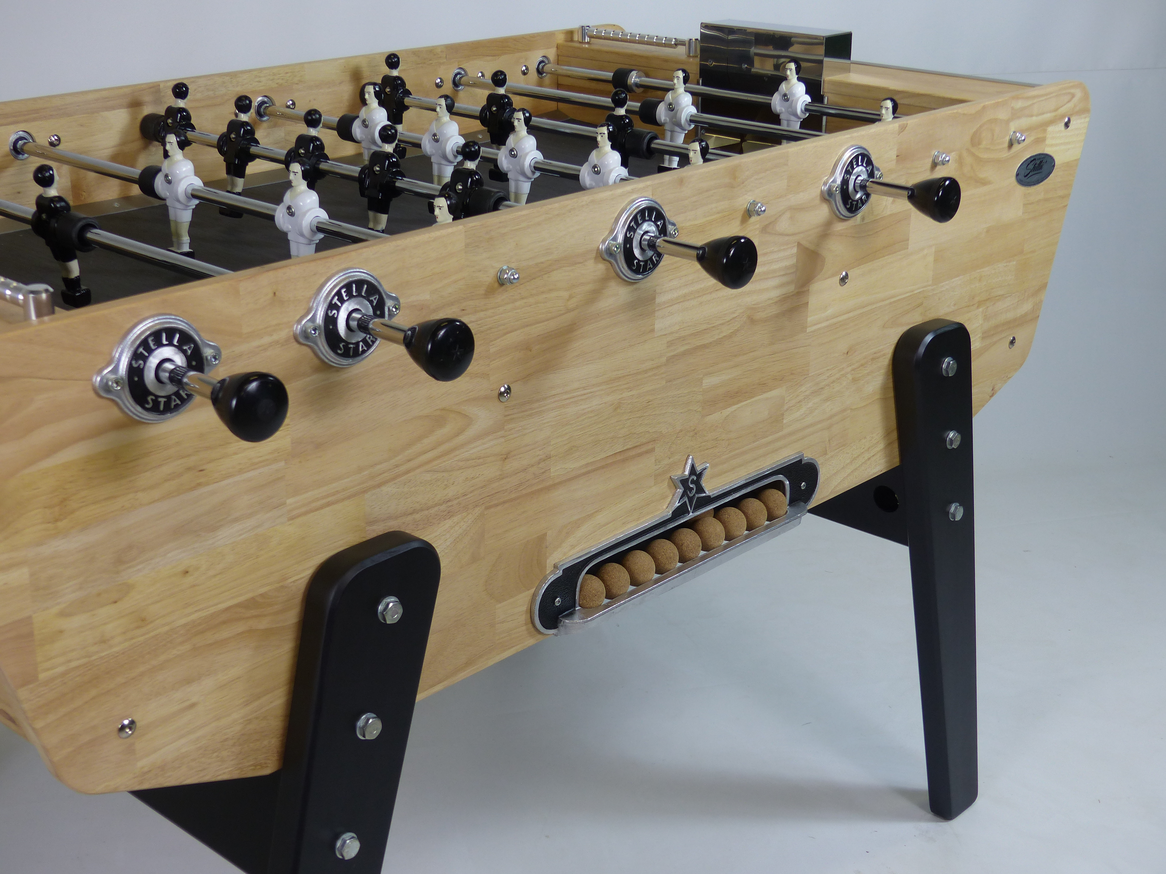 Le Bahia est un baby-foot en bois massif reprenant les lignes de notre baby-foot de café, le Stella Star. Il y apporte noblesse et modernité grâce au panneau de bois HEVEA lamellé-collé, utilisé pour la fabrication de la caisse.