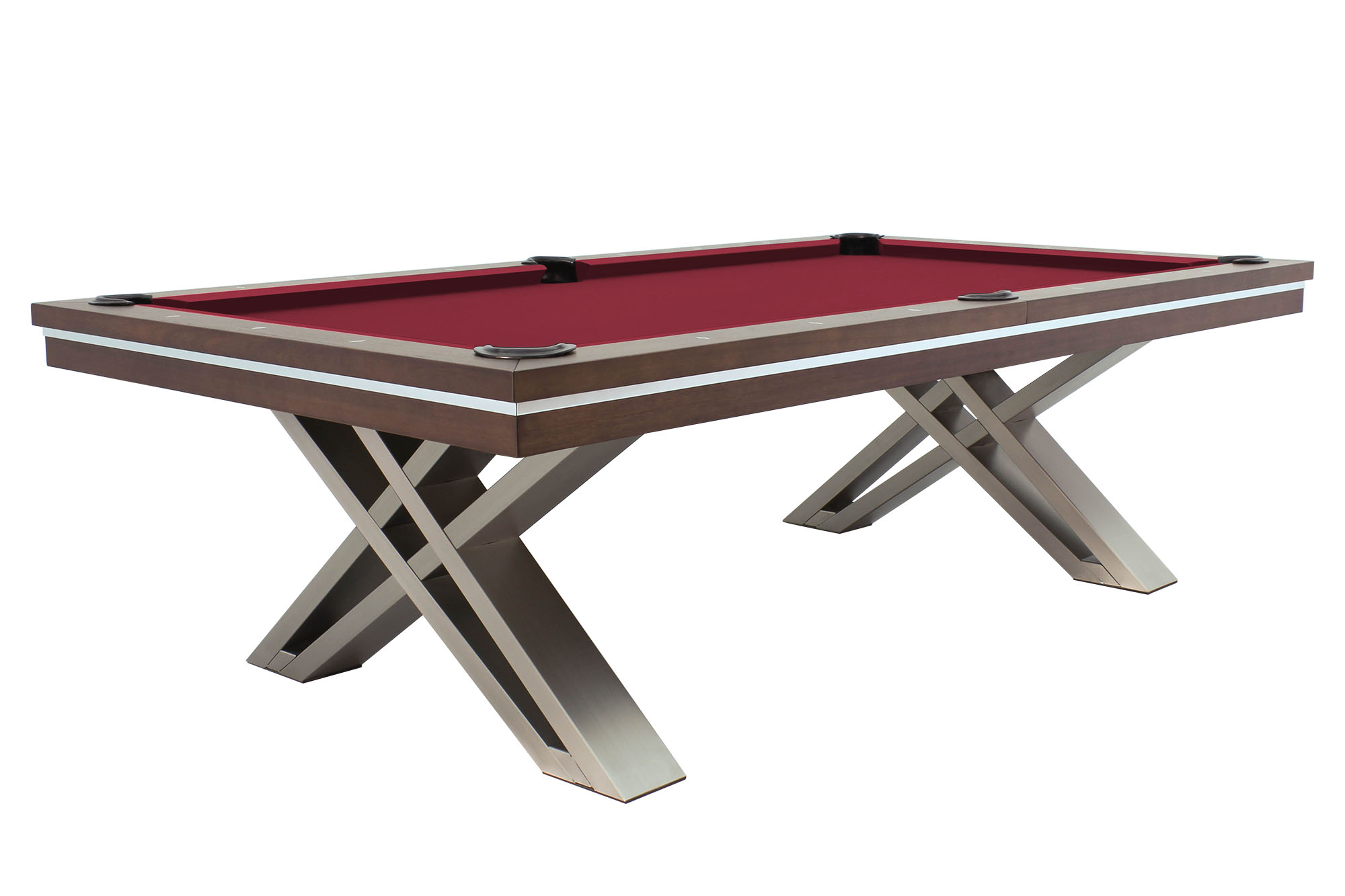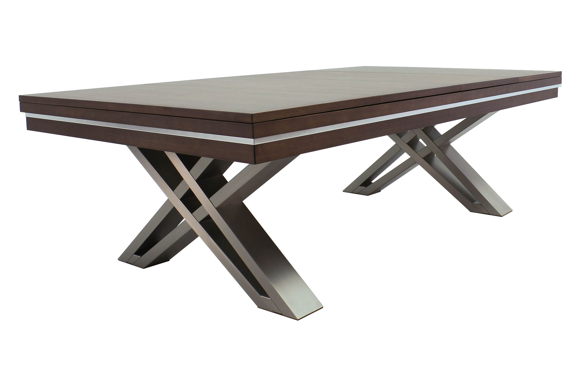 La table de billard / table à manger Pierce de Rasson, de 8 pieds, est fabriquée en bois dur massif et possède une finition en noyer. Les pieds en acier inoxydable brossé, extrêmement solides et croisés, offrent stabilité et un aspect unique. Avec la plaque de couverture facultative, elle peut être rapidement et facilement transformée en table à manger pouvant accueillir jusqu'à 12 personnes. Développée exclusivement par Dynamic Billard pour une utilisation confortable en tant que table à manger en termes de hauteur d'assise.