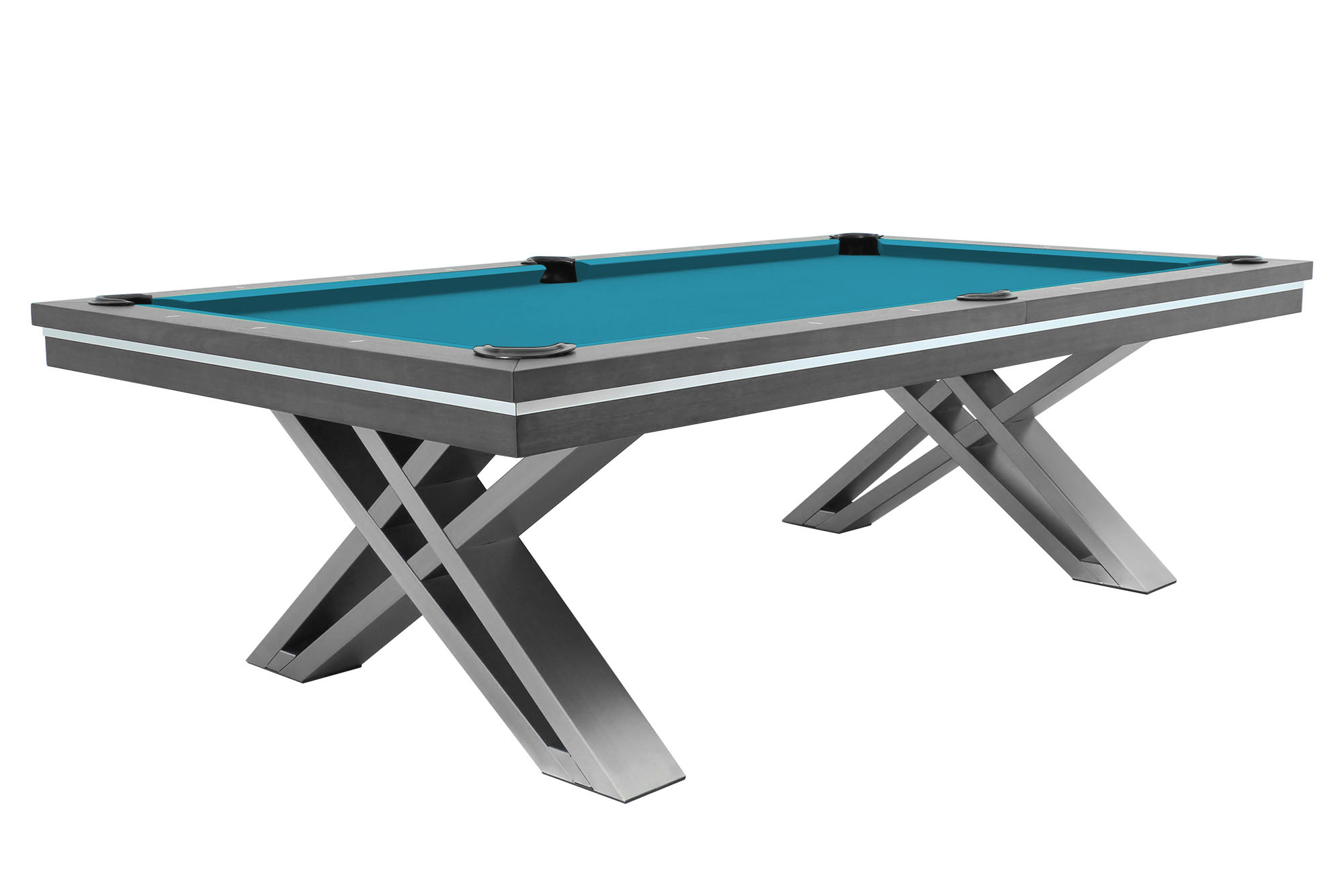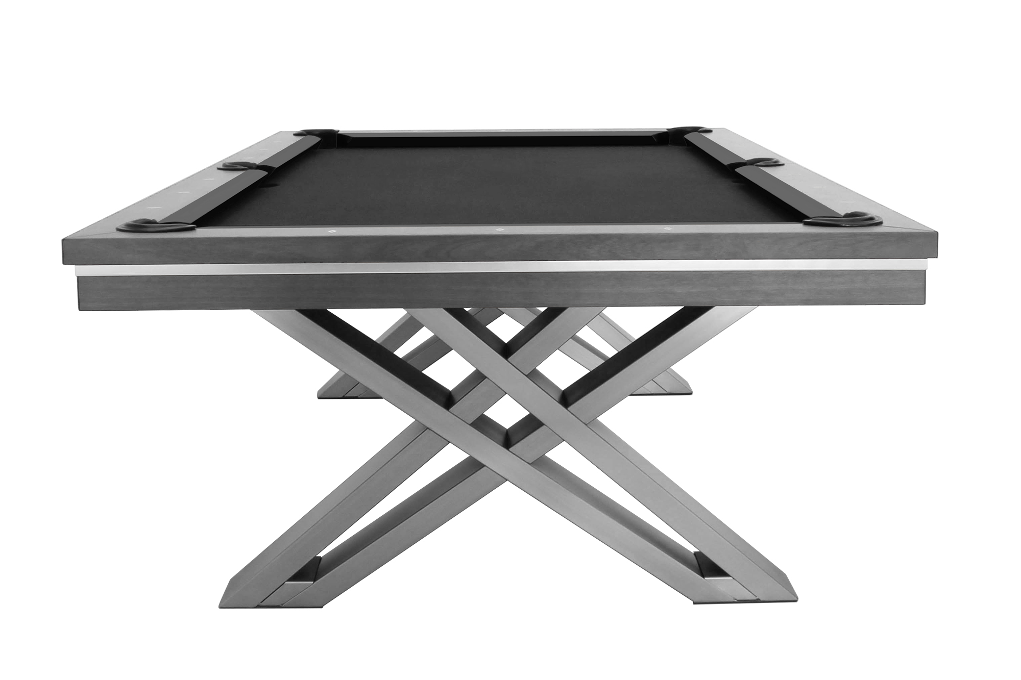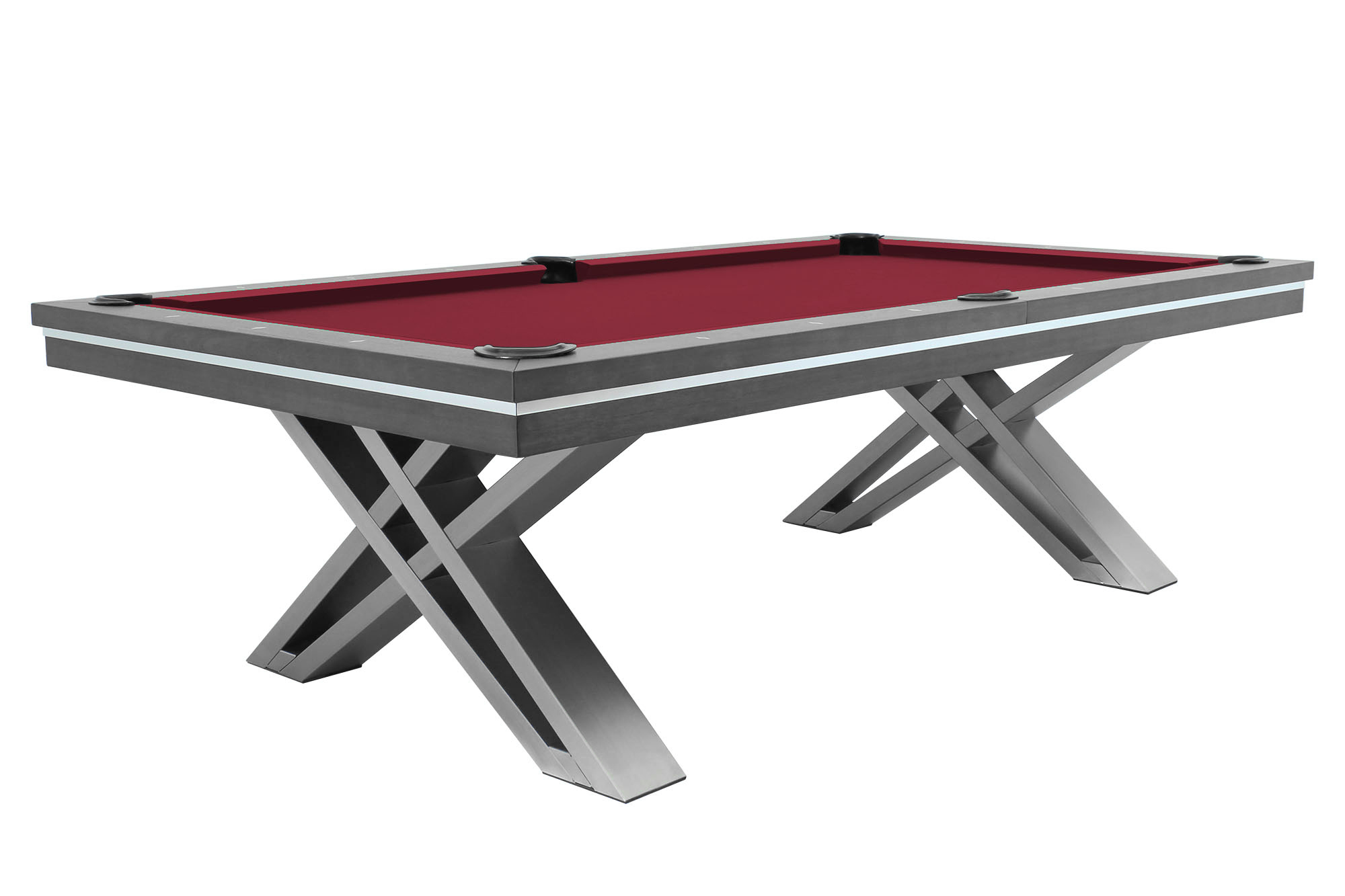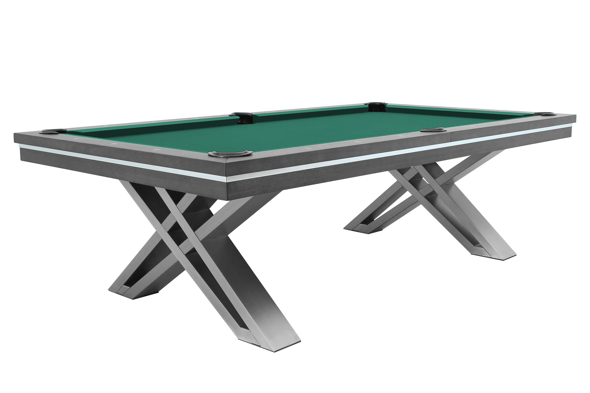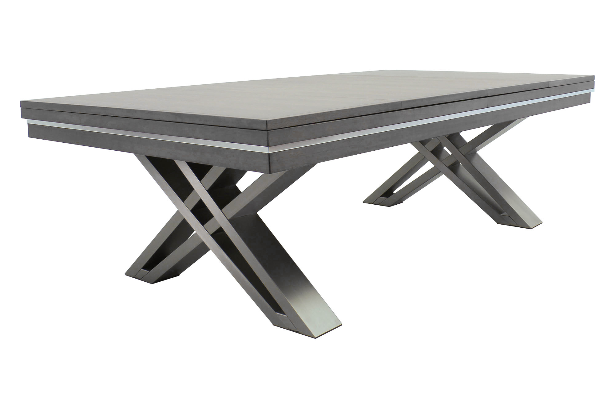 La table de billard / table à manger Pierce de Rasson, de 8 pieds, est fabriquée en bois dur massif et possède une finition en noyer. Les pieds en acier inoxydable brossé, extrêmement solides et croisés, offrent stabilité et un aspect unique. Avec la plaque de couverture facultative, elle peut être rapidement et facilement transformée en table à manger pouvant accueillir jusqu'à 12 personnes. Développée exclusivement par Dynamic Billard pour une utilisation confortable en tant que table à manger en termes de hauteur d'assise.