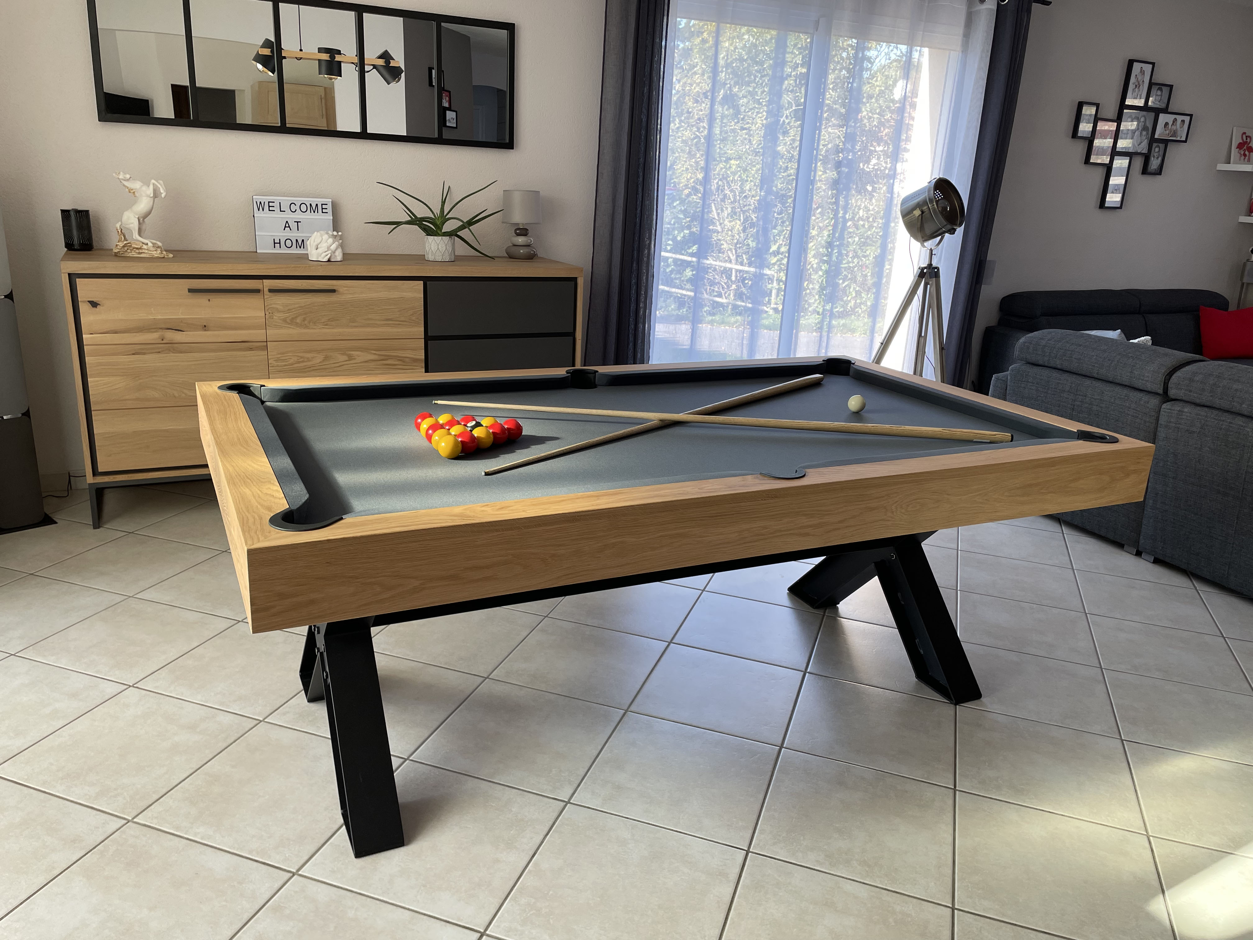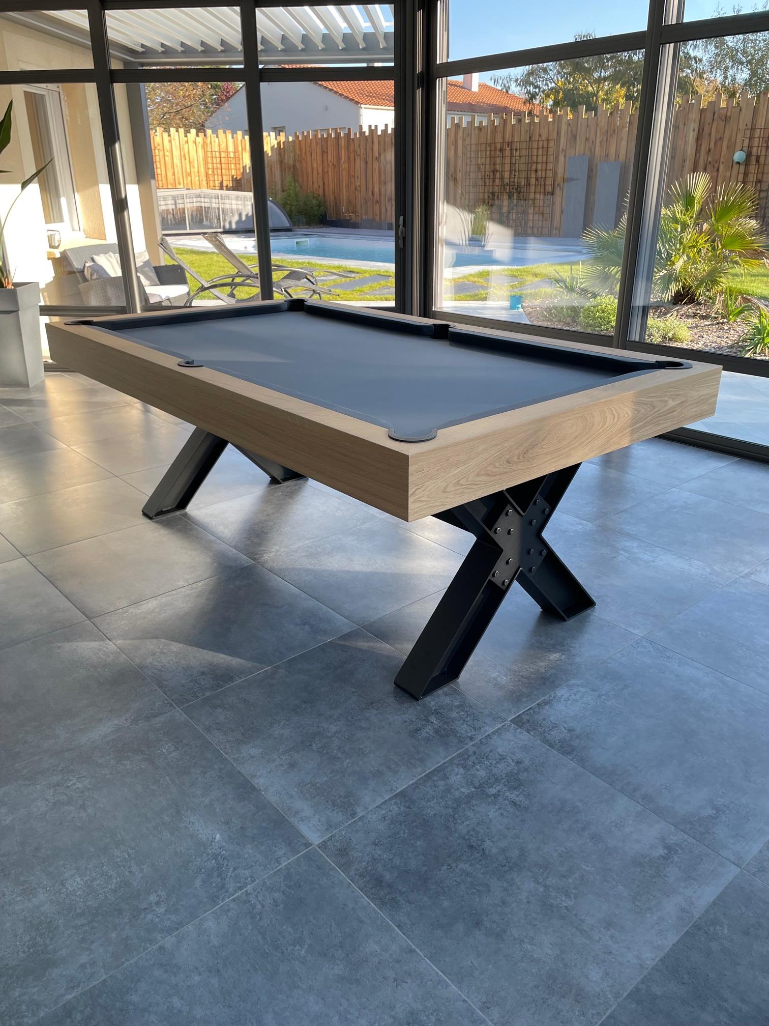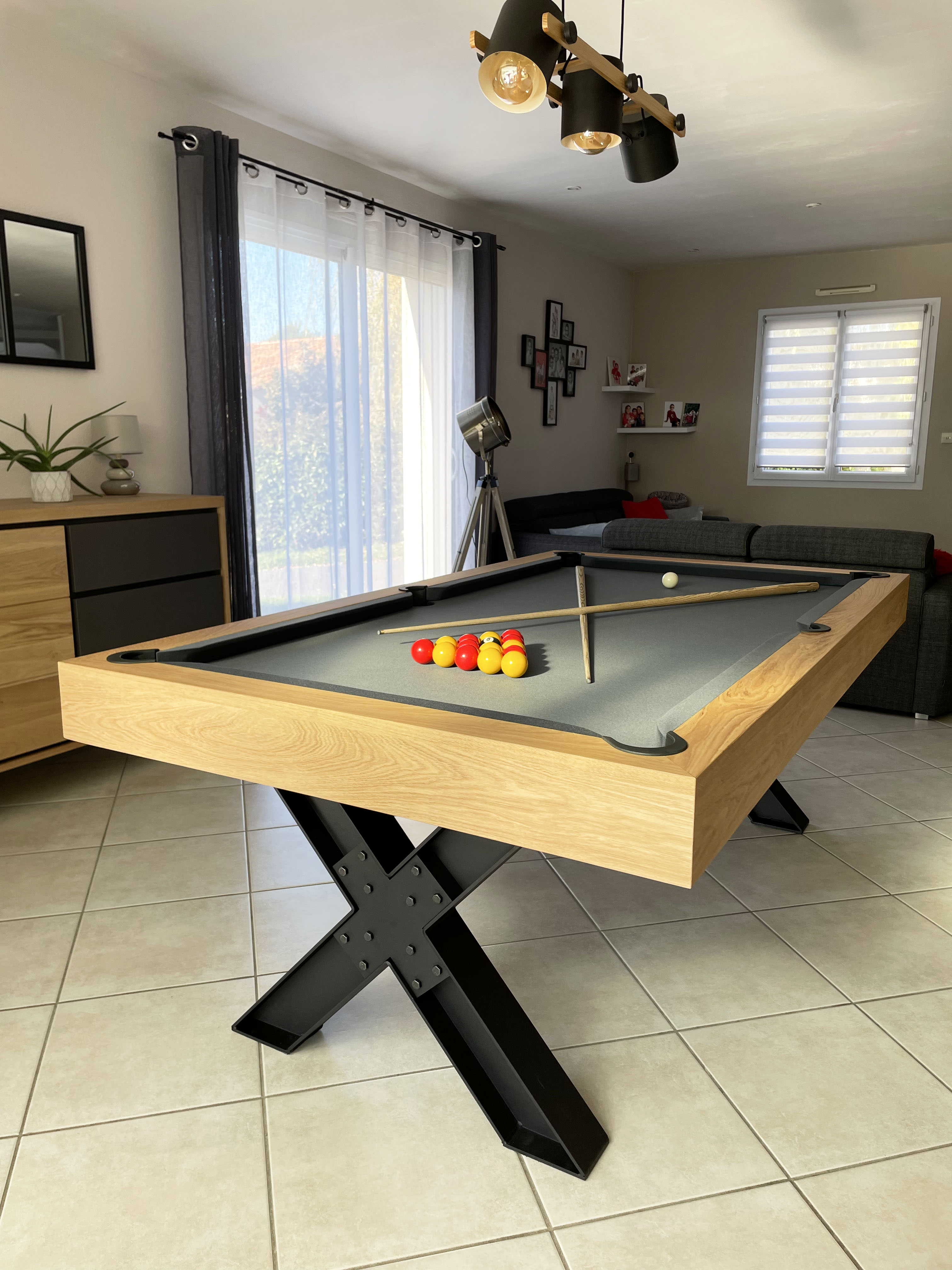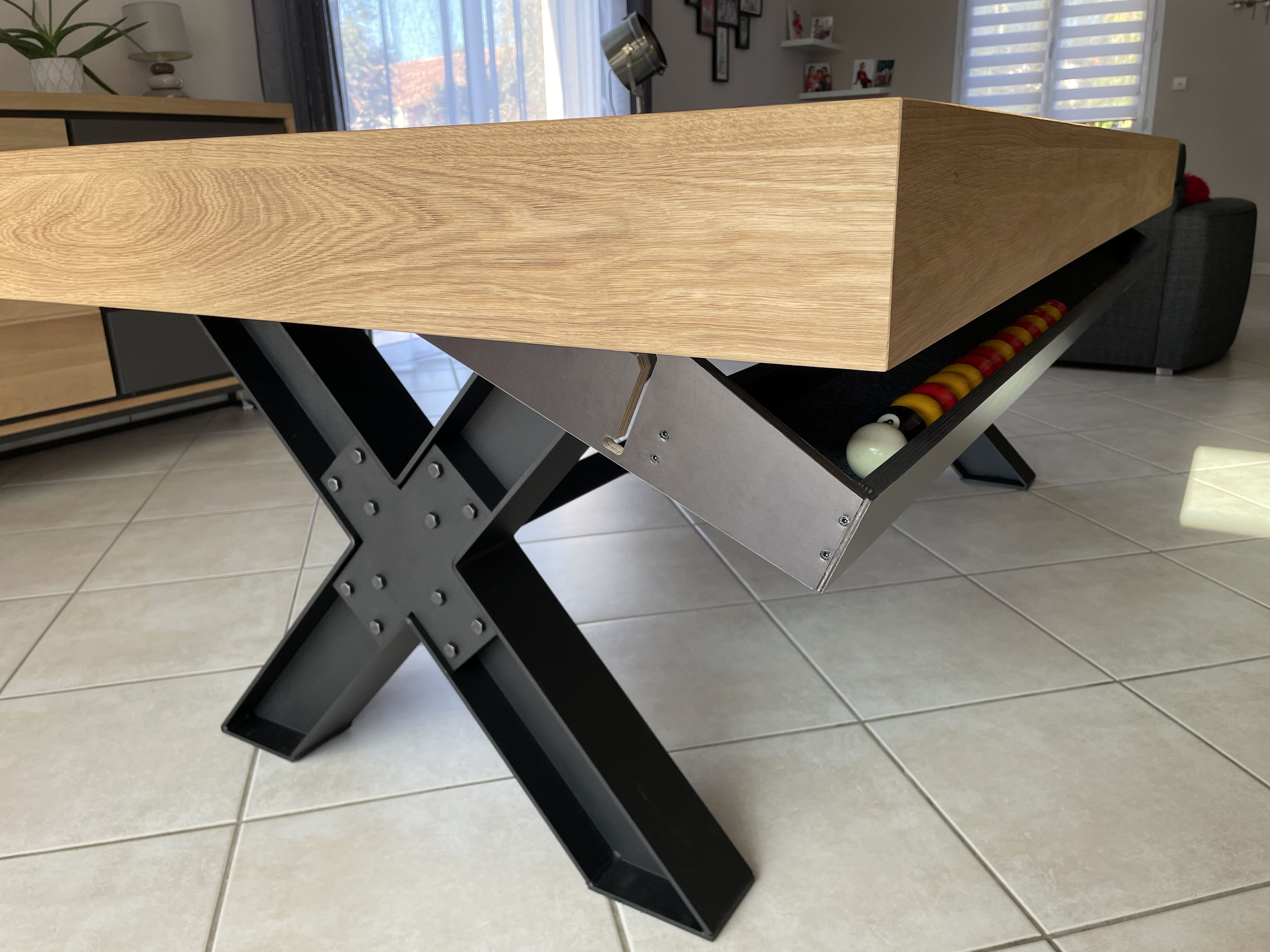 Meuble en Chêne avec pieds acier en X- Cadre de bande en 30 mm d'épaisseur monobloc très rigide.- Pieds avec vérins pour la mise à niveau.- Table de roulement en ardoise 19 mm rectifiée deux faces pour une planéité parfaite.- Ardoise située sur le châssis (facilite la mise en place)- Tissus de marque SIMONIS reconnu N°1 dans le monde du billard. (Vous pouvez choisir la couleur de votre drap de billard sur la photo ci-contre, et nous préciser celle-ci dans le commentaire prévu à cet effet)- Bande de compétition reconnue par les joueurs et professionnels.- Fabrication sur commande numérique assurant une précision irréprochable.- Descente de billes moquettée, sur chaque longueur du billard. L'arrivée des billes est centralisée au milieu de chaque longueur.- Poids du billard 200 kgBillard vendu avec 4 queues, 1 jeu de billes, 1 triangle, 1 brosse, craie, et porte-queues mural[Les billards sont fabriqués sur commande. Les délais de livraison sont, par conséquent, de plusieurs semaines. Nous vous tenons informés de ces derniers à la commande]