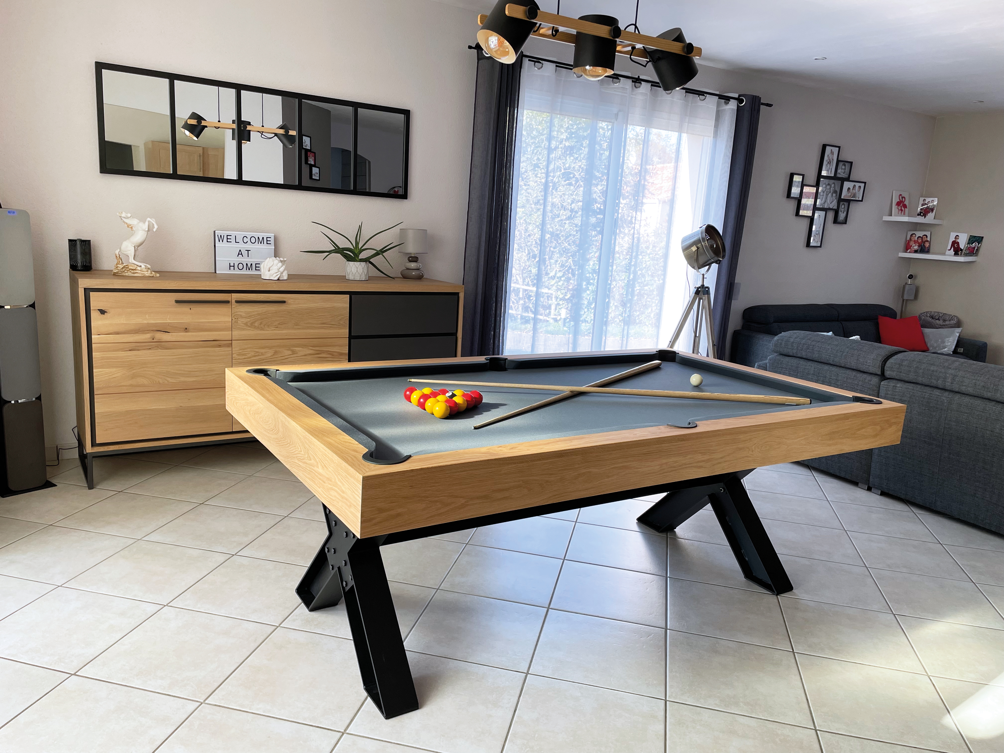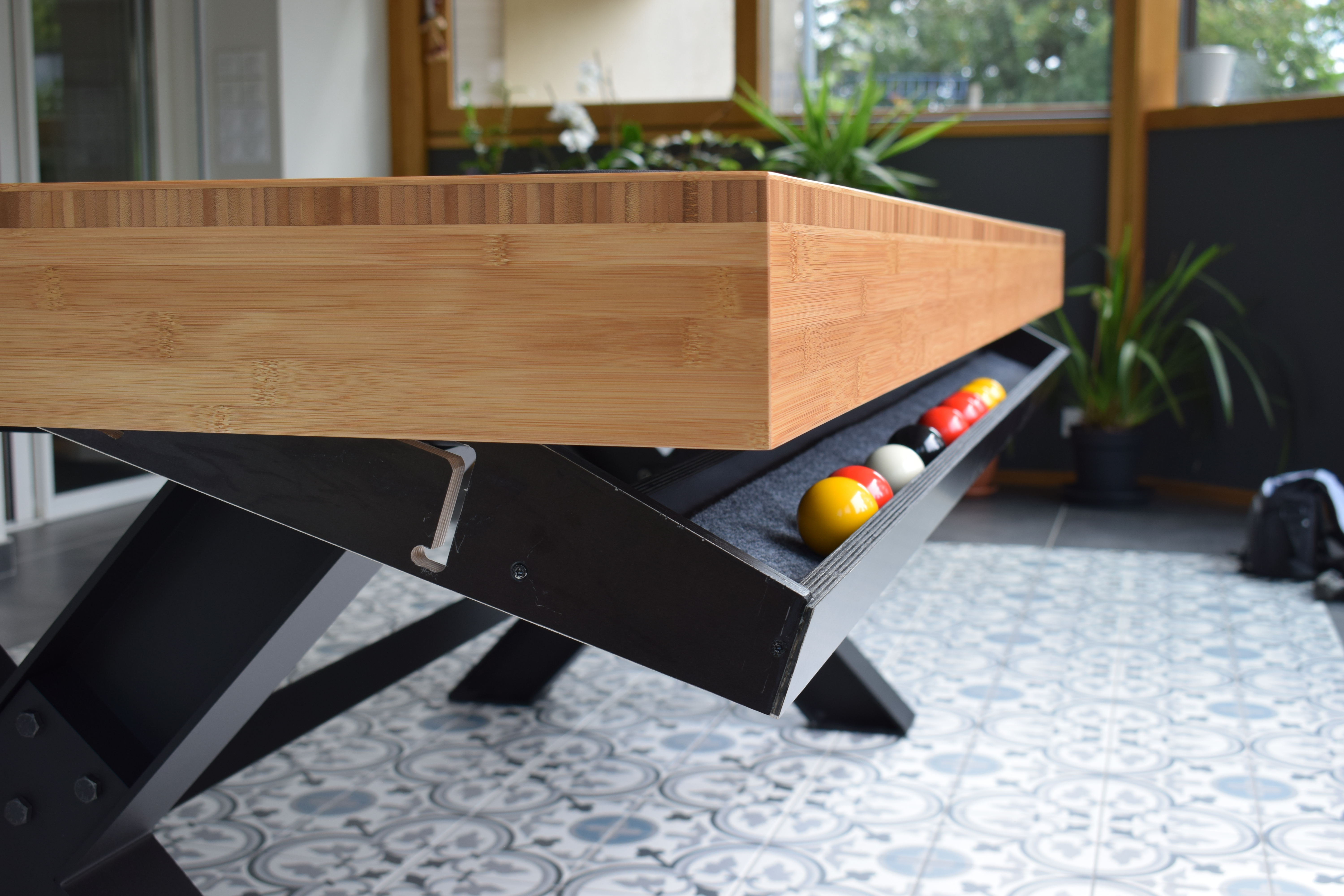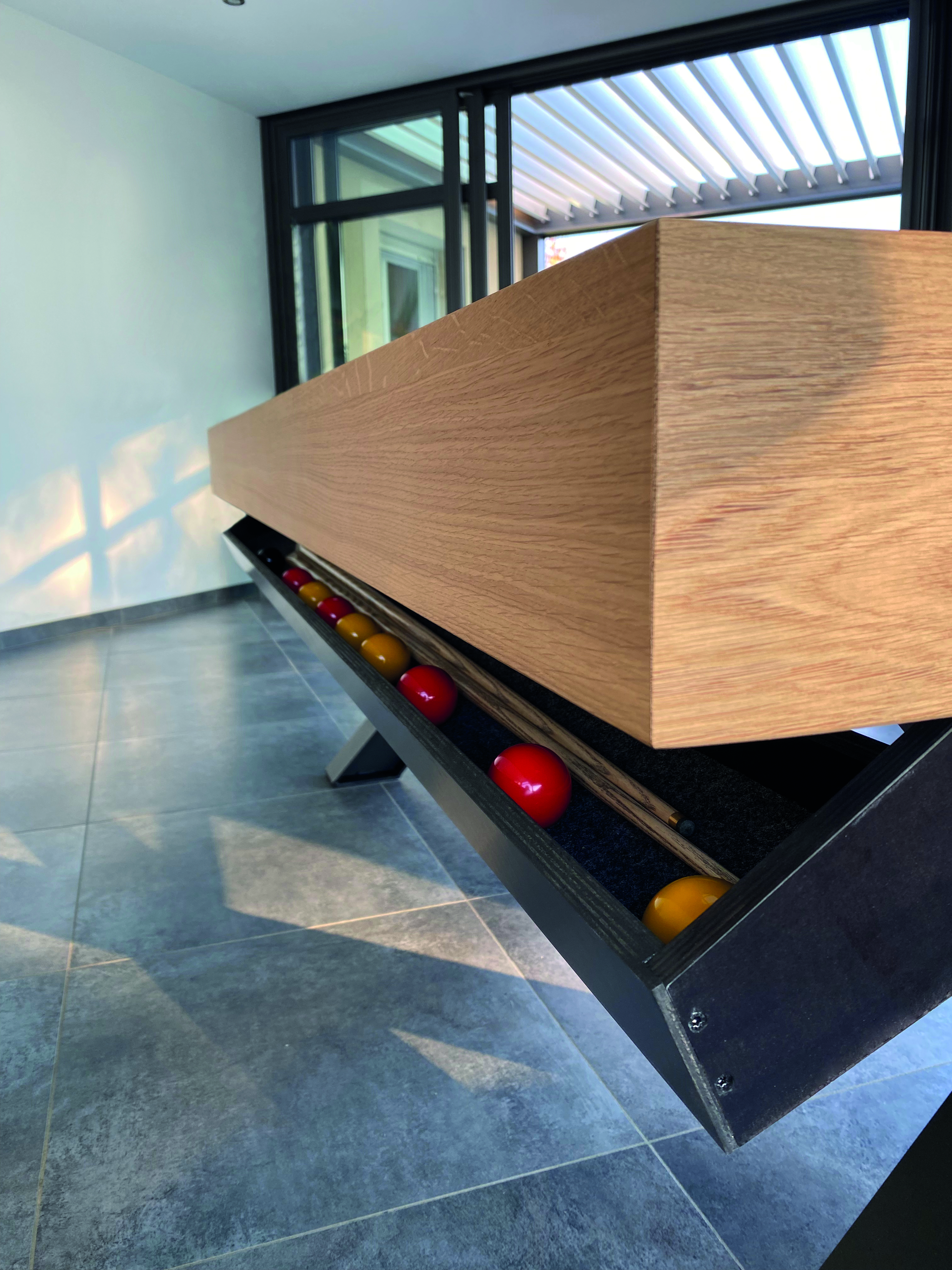 Meuble en Chêne avec pieds acier en X- Cadre de bande en 30 mm d'épaisseur monobloc très rigide.- Pieds avec vérins pour la mise à niveau.- Table de roulement en ardoise 19 mm rectifiée deux faces pour une planéité parfaite.- Ardoise située sur le châssis (facilite la mise en place)- Tissus de marque SIMONIS reconnu N°1 dans le monde du billard. (Vous pouvez choisir la couleur de votre drap de billard sur la photo ci-contre, et nous préciser celle-ci dans le commentaire prévu à cet effet)- Bande de compétition reconnue par les joueurs et professionnels.- Fabrication sur commande numérique assurant une précision irréprochable.- Descente de billes moquettée, sur chaque longueur du billard. L'arrivée des billes est centralisée au milieu de chaque longueur.- Poids du billard 200 kgBillard vendu avec 4 queues, 1 jeu de billes, 1 triangle, 1 brosse, craie, et porte-queues mural[Les billards sont fabriqués sur commande. Les délais de livraison sont, par conséquent, de plusieurs semaines. Nous vous tenons informés de ces derniers à la commande]