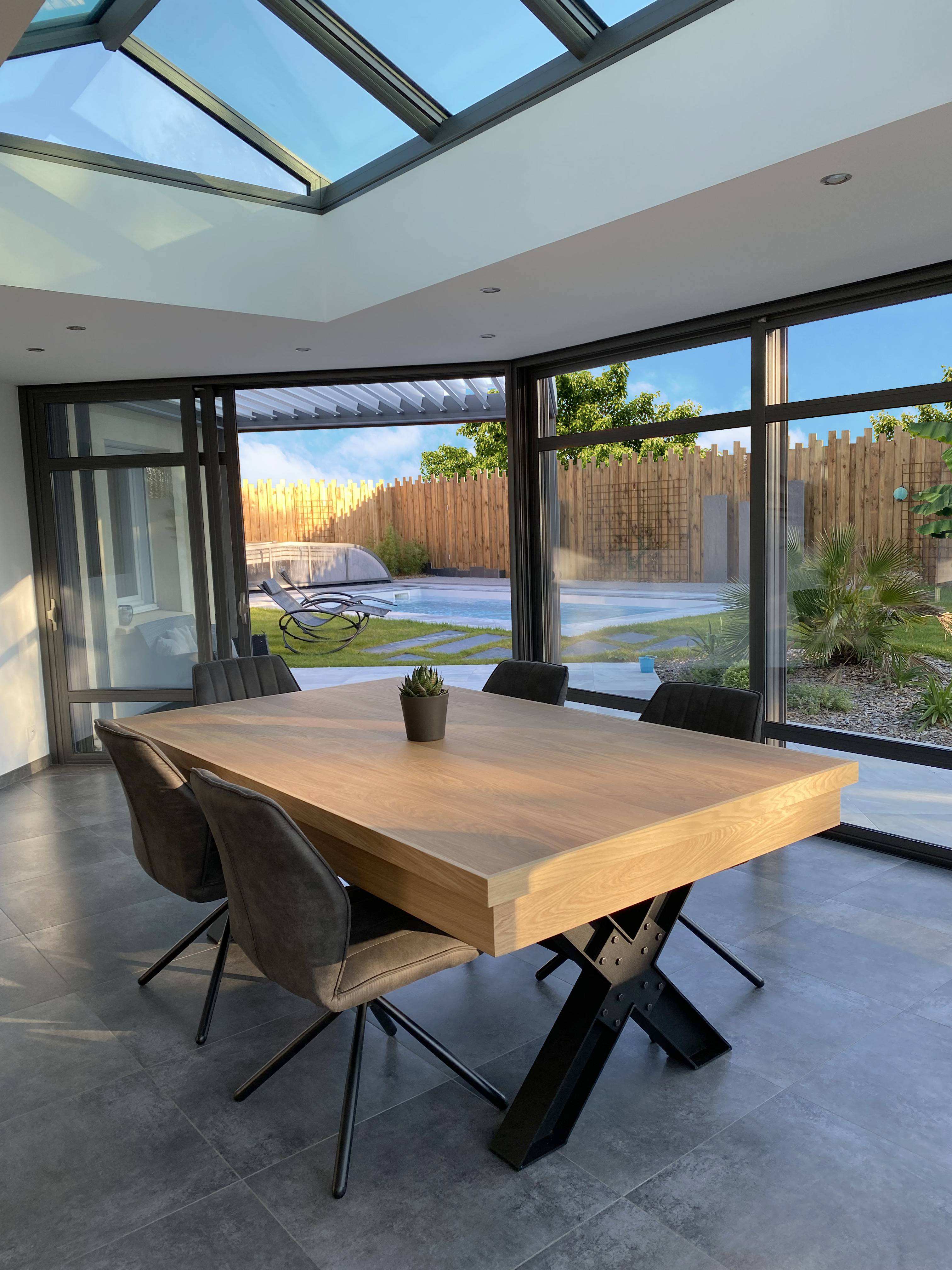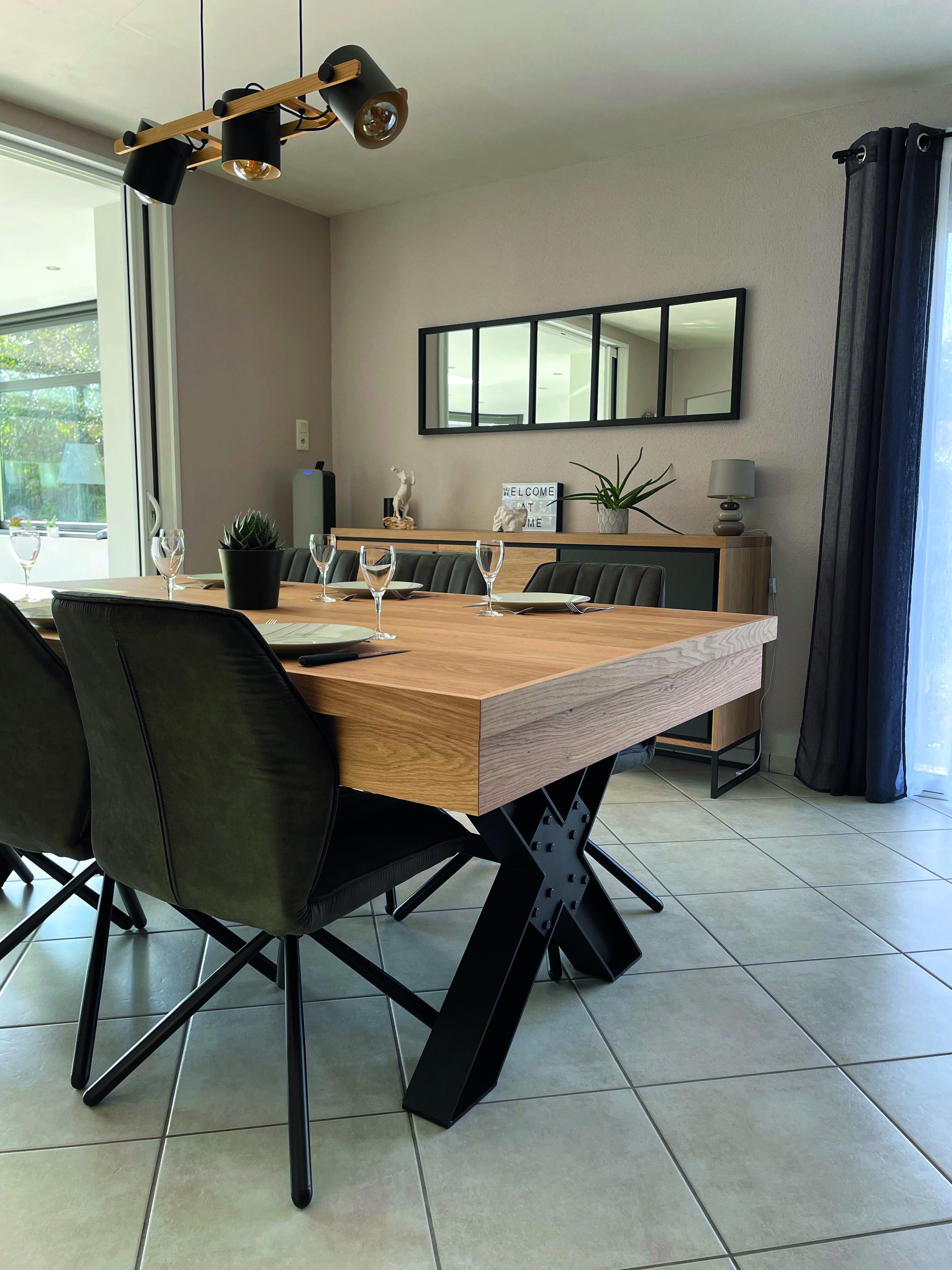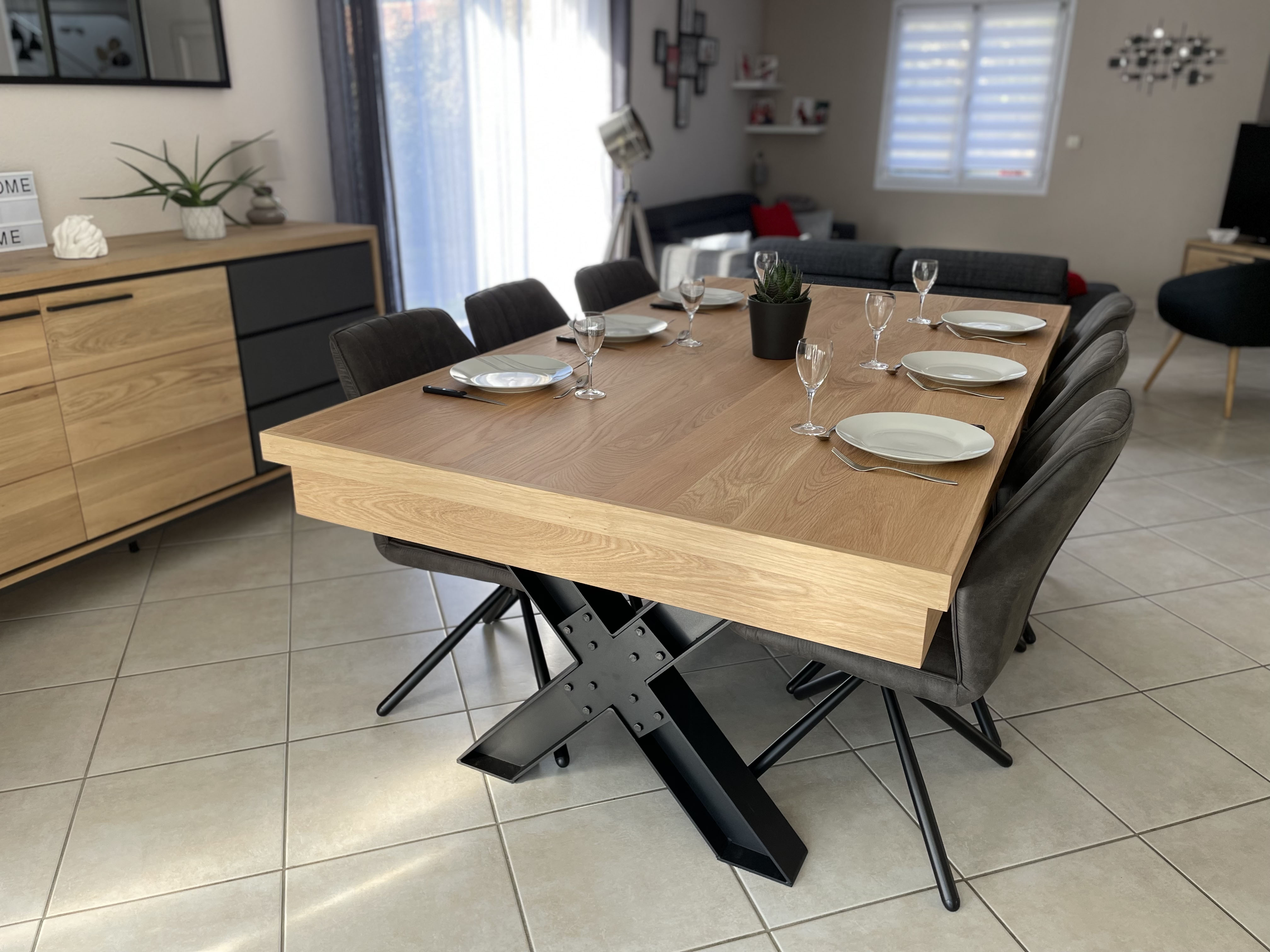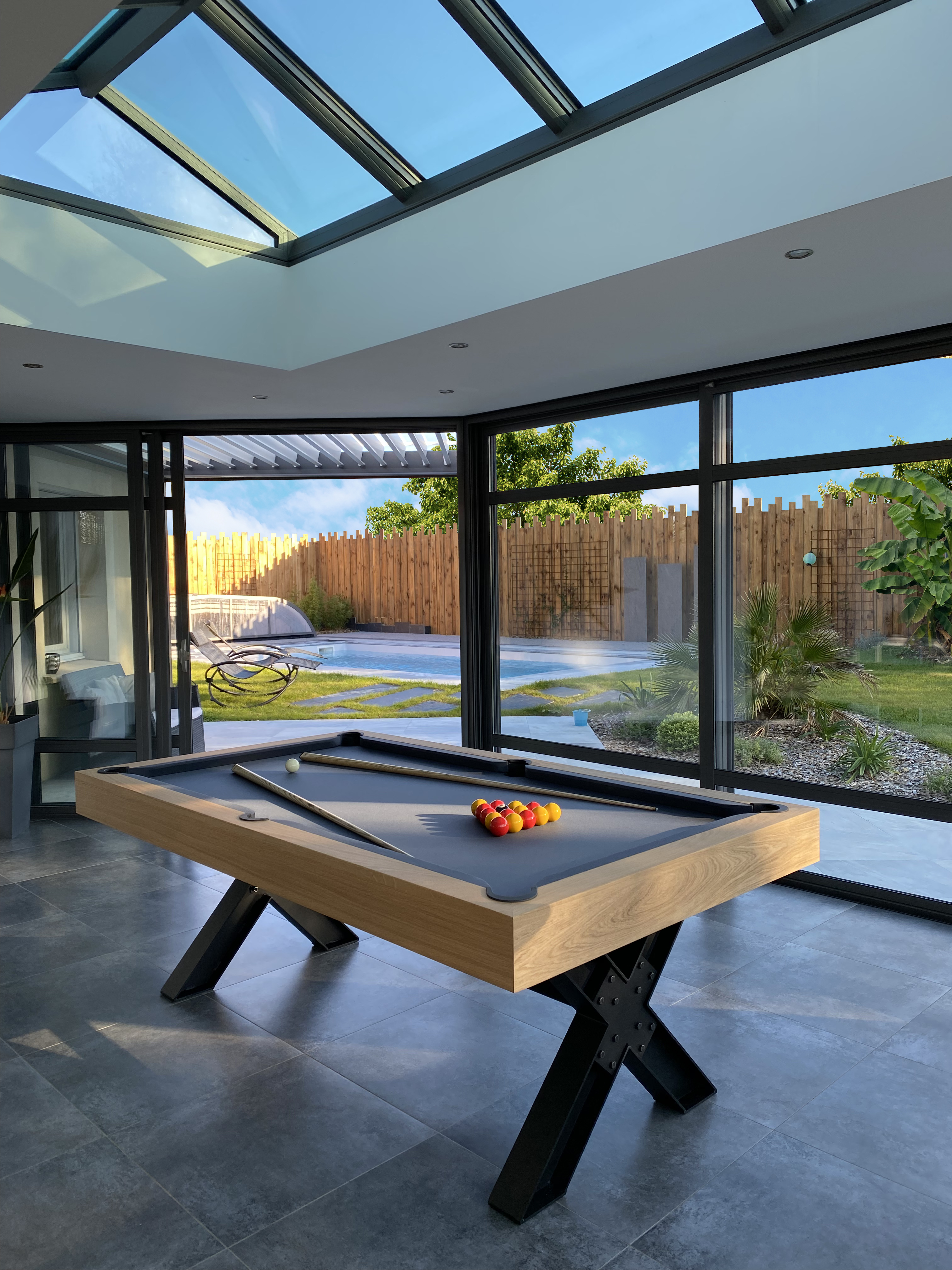 Meuble en Chêne avec pieds acier en X- Cadre de bande en 30 mm d'épaisseur monobloc très rigide.- Pieds avec vérins pour la mise à niveau.- Table de roulement en ardoise 19 mm rectifiée deux faces pour une planéité parfaite.- Ardoise située sur le châssis (facilite la mise en place)- Tissus de marque SIMONIS reconnu N°1 dans le monde du billard. (Vous pouvez choisir la couleur de votre drap de billard sur la photo ci-contre, et nous préciser celle-ci dans le commentaire prévu à cet effet)- Bande de compétition reconnue par les joueurs et professionnels.- Fabrication sur commande numérique assurant une précision irréprochable.- Descente de billes moquettée, sur chaque longueur du billard. L'arrivée des billes est centralisée au milieu de chaque longueur.- Poids du billard 200 kgBillard vendu avec 4 queues, 1 jeu de billes, 1 triangle, 1 brosse, craie, et porte-queues mural[Les billards sont fabriqués sur commande. Les délais de livraison sont, par conséquent, de plusieurs semaines. Nous vous tenons informés de ces derniers à la commande]