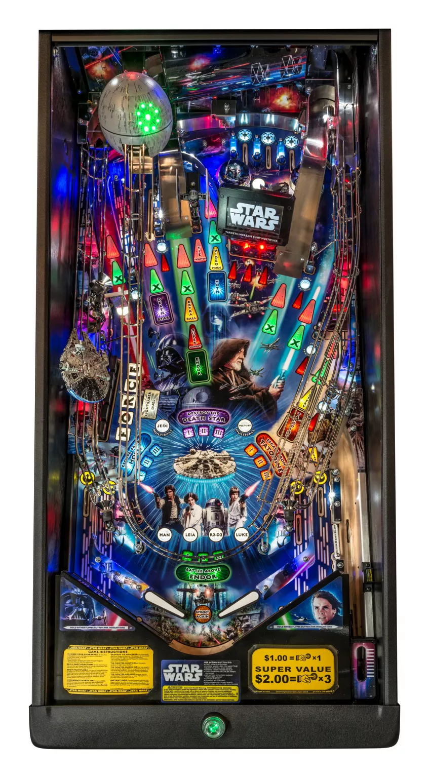 Les flippers Star Wars seront disponibles dans les modèles Pro et Premium. Le jeu plongera les joueurs dans l'environnement dynamique et stimulant du flipper Star Wars alors qu'ils se battent pour rendre justice à la galaxie. Le jeu comprend des discours et des images sélectionnés de la trilogie Star Wars originale; inserts éclairés par LED à changement de couleur; et un TIE Fighter sculpté.
