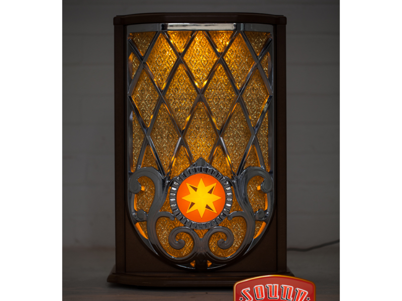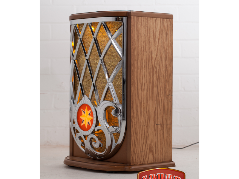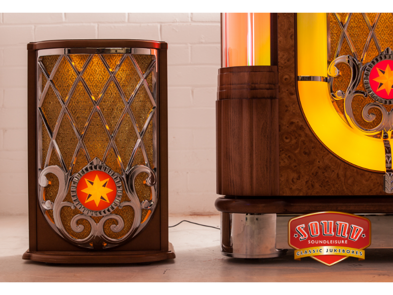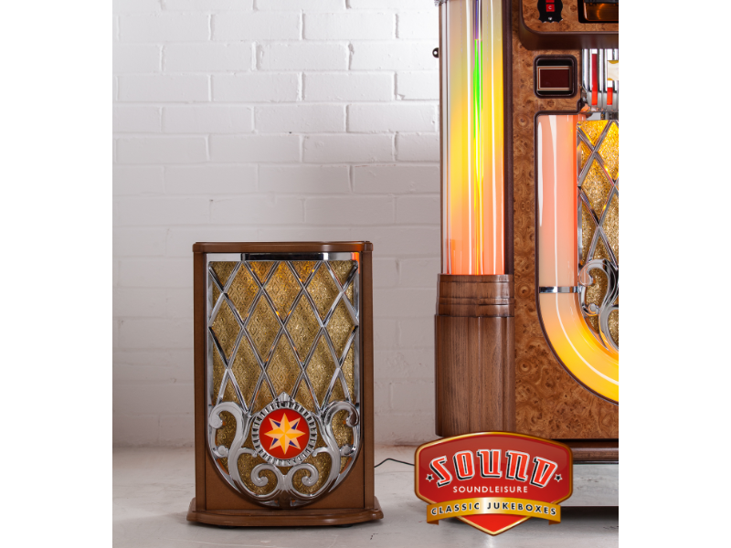 Nos haut-parleurs 1015 sont fabriqués à la main avec le même soin et l’attention aux détails que la gamme des Juke-box Sound Leisure. Ils sont faits pour compléter le Juke-box 1015 autant pour son style que pour sa qualité sonore, et peuvent être finis dans les mêmes offres de grain de bois ou peinture que le juke-box.