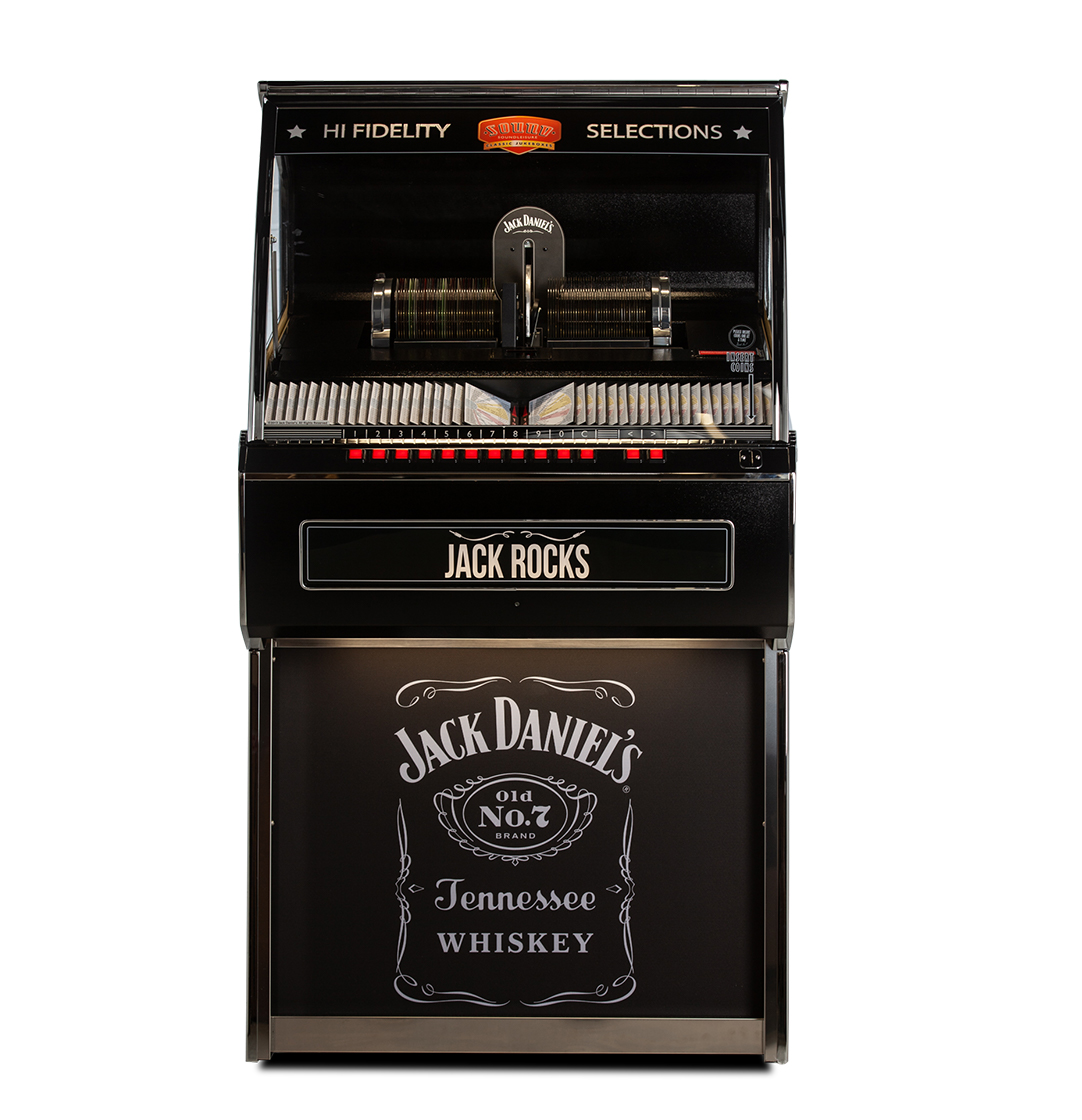 Basé sur notre très populaire cabinet Rocket des années 1950, le jukebox CD Jack Daniel’s sous licence présente l’artwork emblématique de la marque, avec un boîtier entièrement noir, une métallisation noire en poudre et un intérieur qui contraste magnifiquement avec les décorations métalliques chromées et hautement polies.