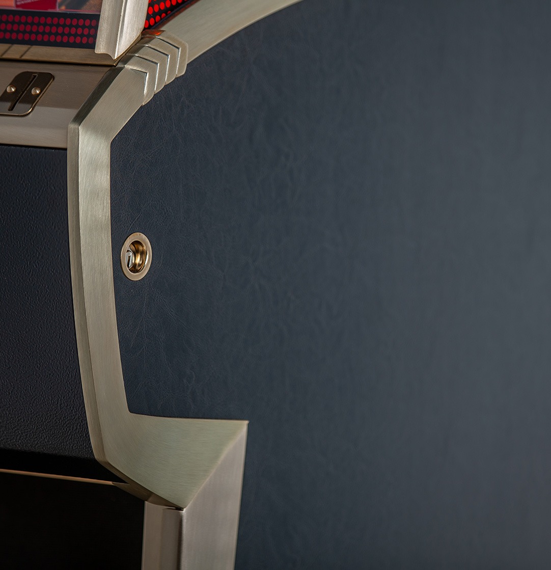 Des moulures en métal massif finies en laque dorée brossée ajoutent une touche luxueuse. Le logo iconique “ELVIS”, qui apparaissait de manière proéminente dans le “stand up show”, est découpé dans la coque du juke-box et rétroéclairé en rouge vif, créant un effet dramatique.