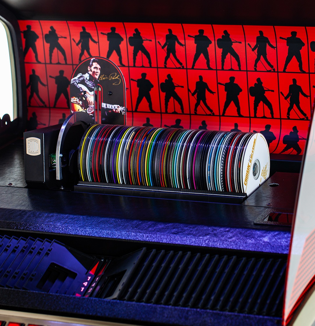 À l’intérieur, le juke-box présente un arrière-plan de silhouettes d’Elvis en rouge et noir, ainsi qu’une image emblématique du King tirée de la performance en direct.