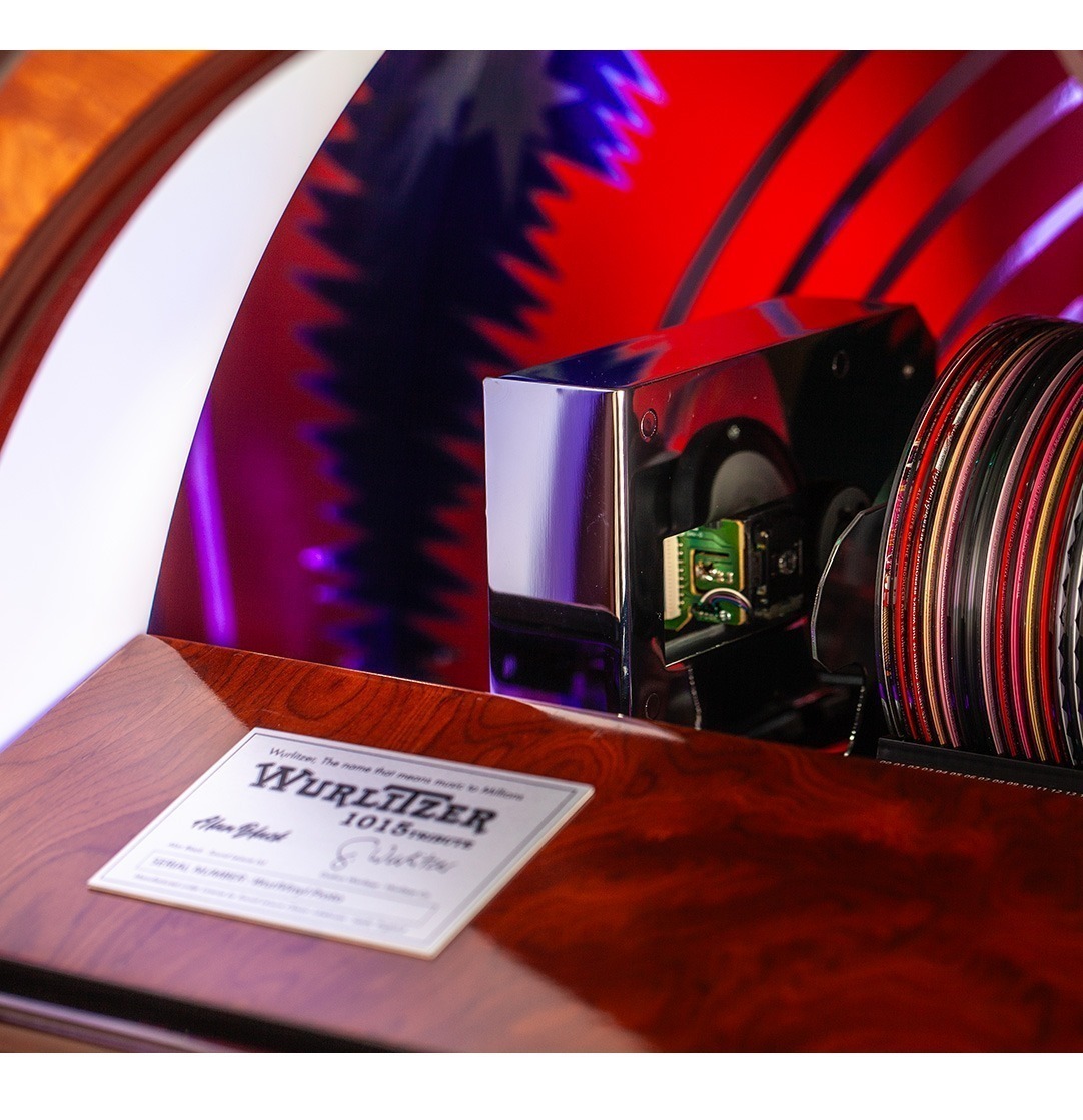 Enfin, chaque jukebox affiche fièrement le nom légendaire Wurlitzer, avec une plaque anodisée comportant le numéro de série et une reproduction des signatures d'Alan Black et Gudrun Wurlitzer sur l’étagère intérieure.