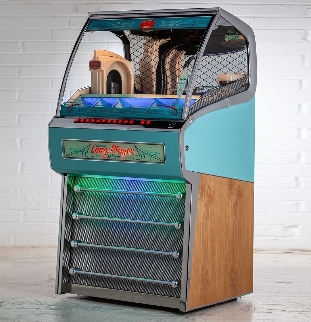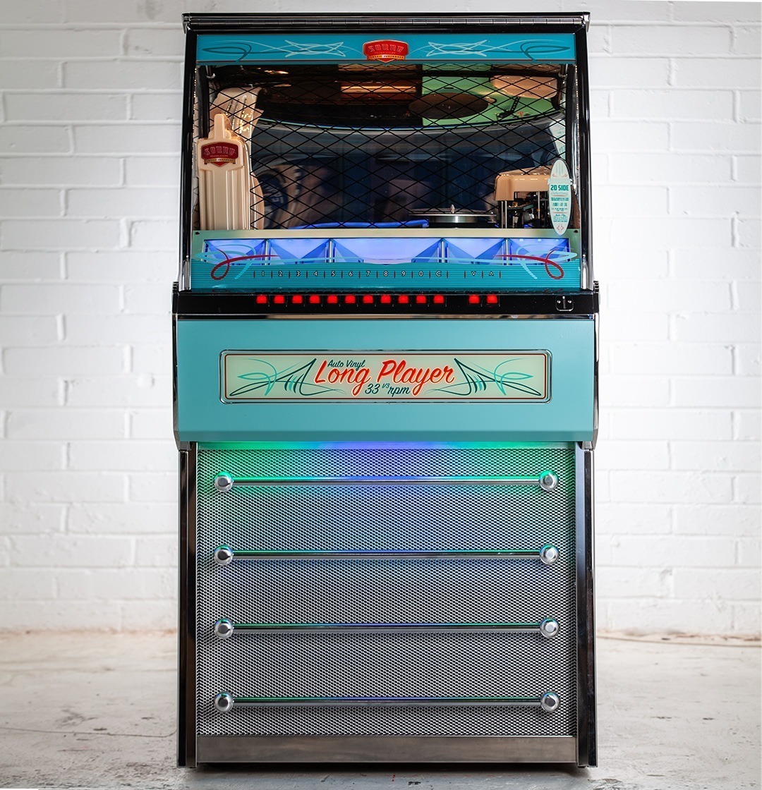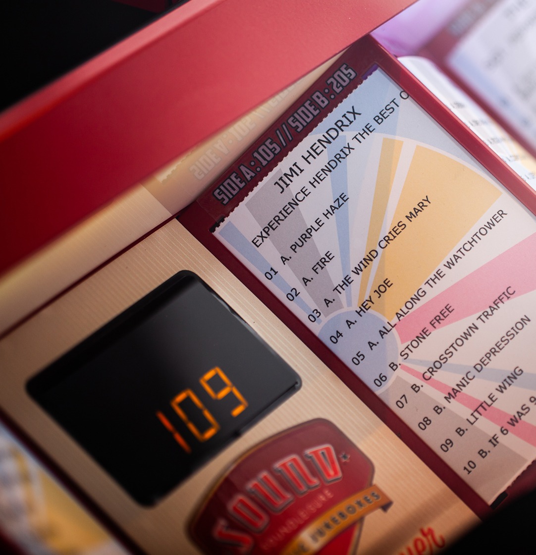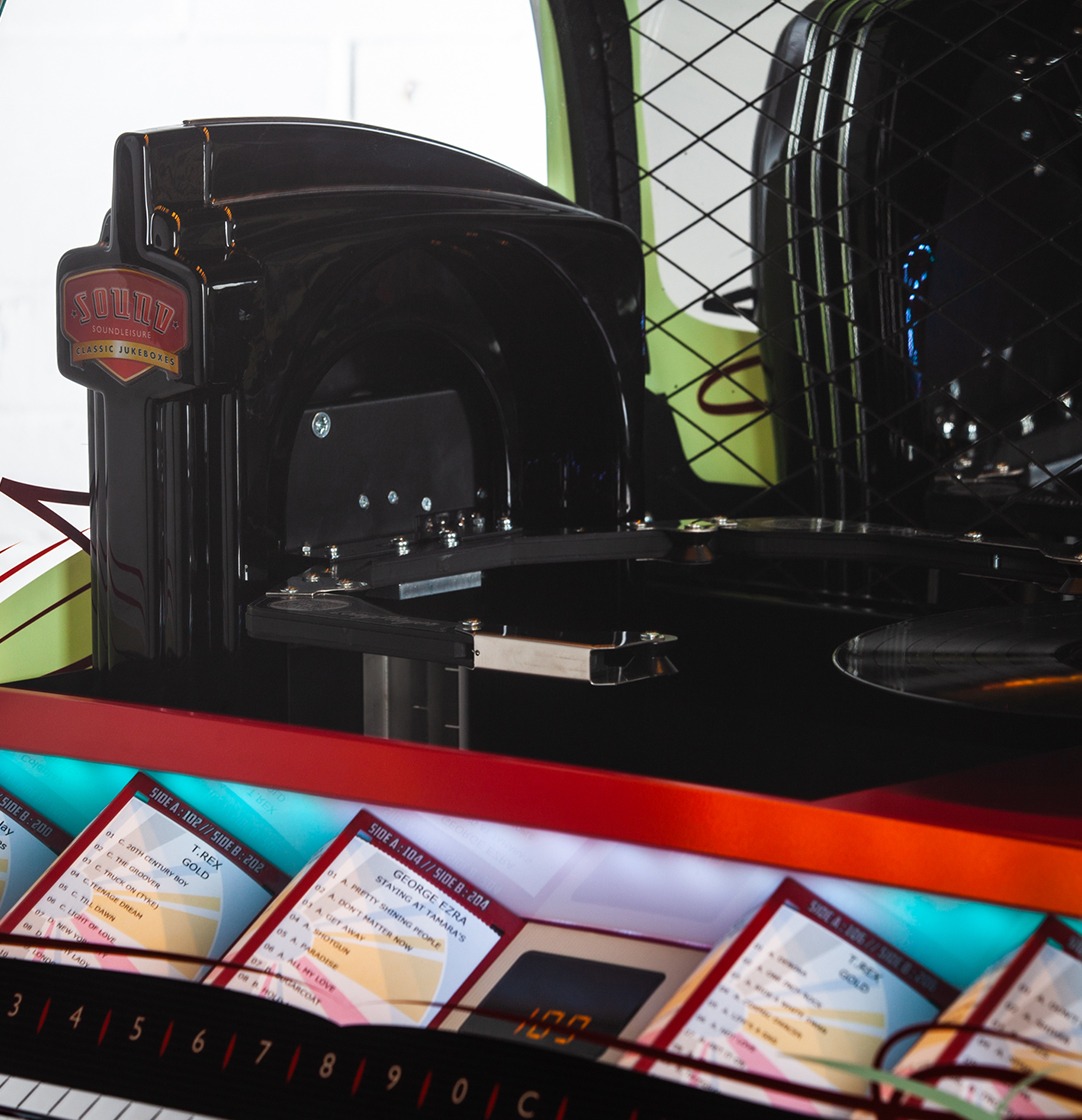 Nos juke-boxes offrent une expérience multi-sensorielle unique pour les passionnés de musique, car vous pouvez observer le bras de transfert choisir soigneusement le vinyle sélectionné et le livrer à la platine, puis le "retourner" pour présenter la face désirée au plateau.