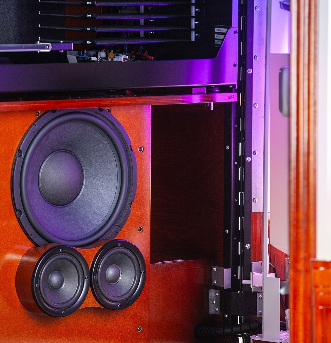Les grilles de haut-parleurs moulées et chromées ainsi que les décorations du boîtier complètent la finition exquise, tandis que les tubes à bulles champagne dansants et l’éclairage LED basse consommation ‘Diamond Pack’ de Sound Leisure éveillent les sens.