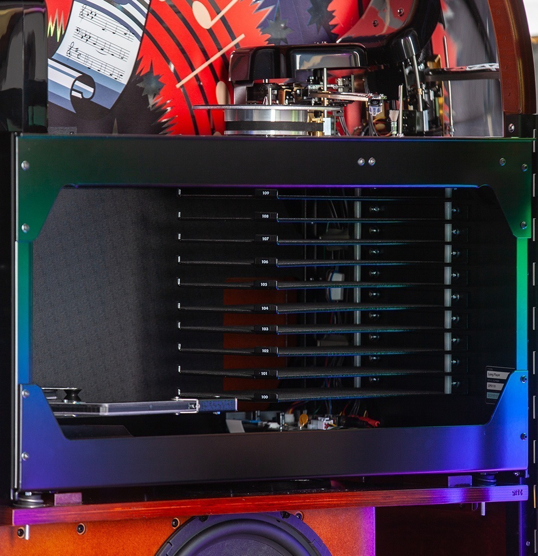Ces juke-boxes offrent une expérience unique et multi-sensorielle, où le bras de transfert sélectionne soigneusement et retourne le vinyle pour présenter la face désirée.