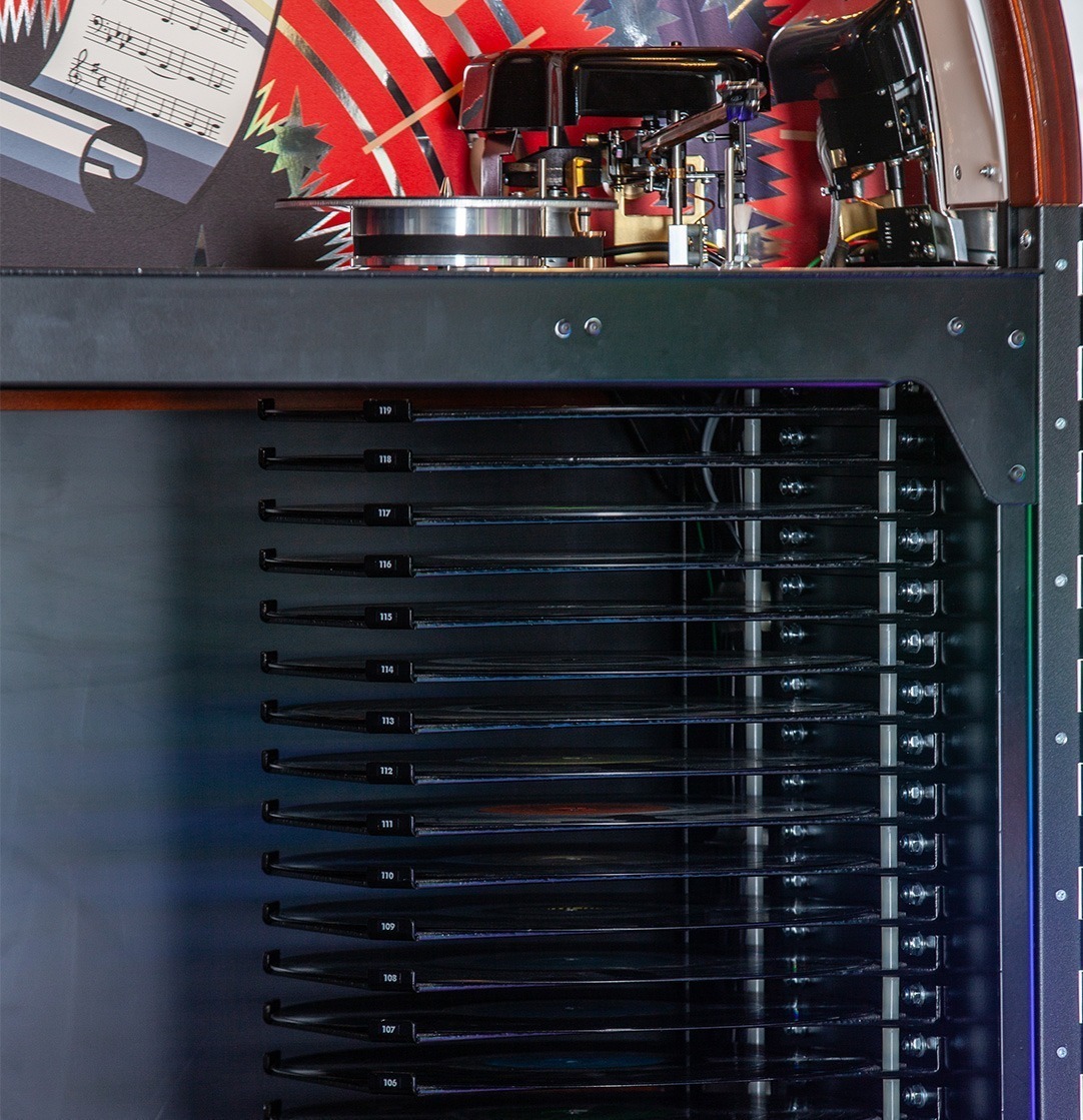 Ces juke-boxes offrent une expérience unique et multi-sensorielle, où le bras de transfert sélectionne soigneusement et retourne le vinyle pour présenter la face désirée.