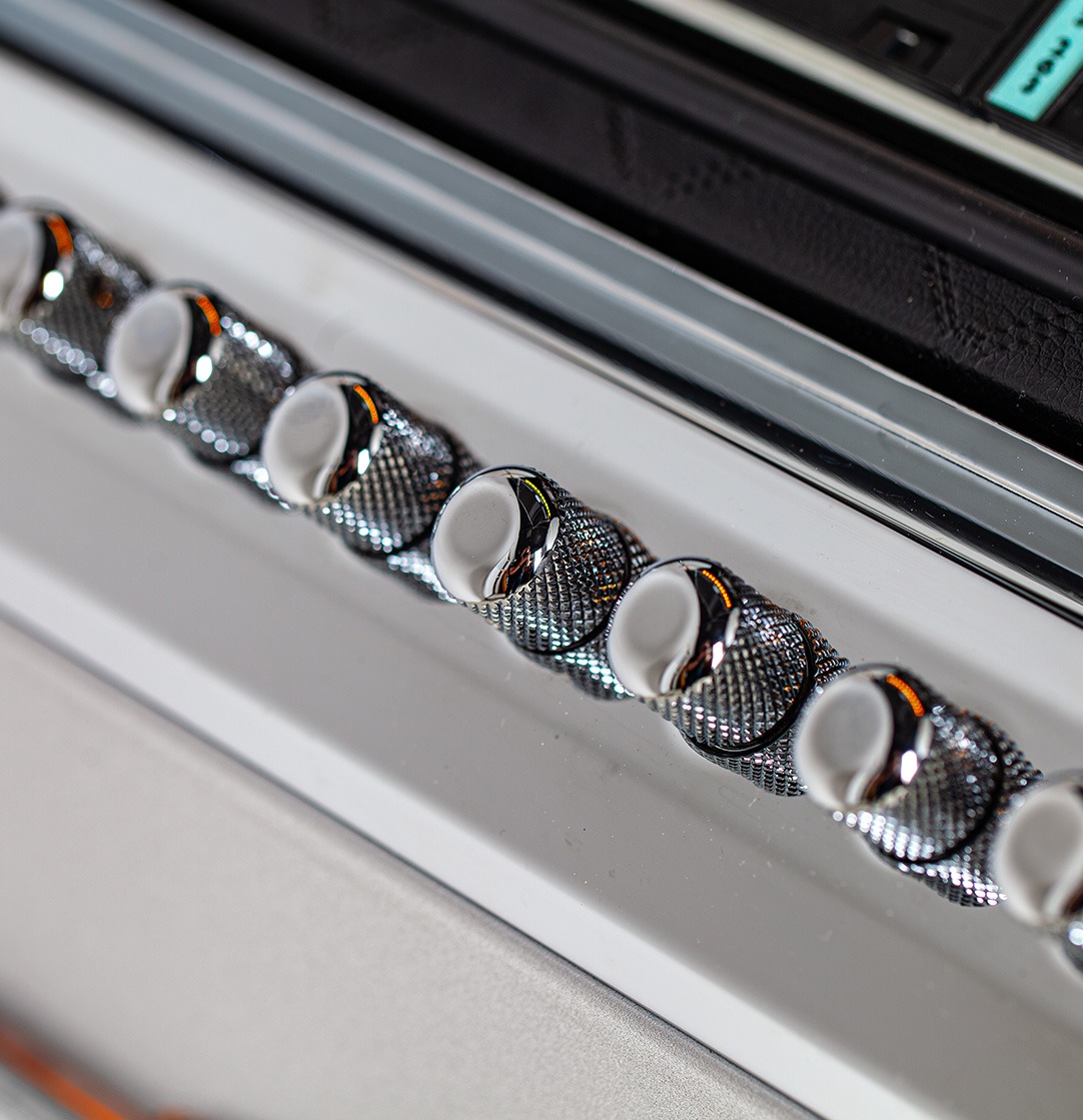 Le meuble inférieur en bois avec texture unique "Pyramide" et les panneaux intérieurs en simili cuir matelassé et piqué en forme de diamant ajoutent des couches de sophistication, faisant de ce juke-box un véritable chef-d'œuvre. Conçu avec une attention méticuleuse aux détails, le Streamliner présente une grille de haut-parleur chromée en forme de ‘V’ dans le style des années 50 et des boutons de sélection en aluminium striés, offrant une expérience tactile rappelant les équipements audio vintage.