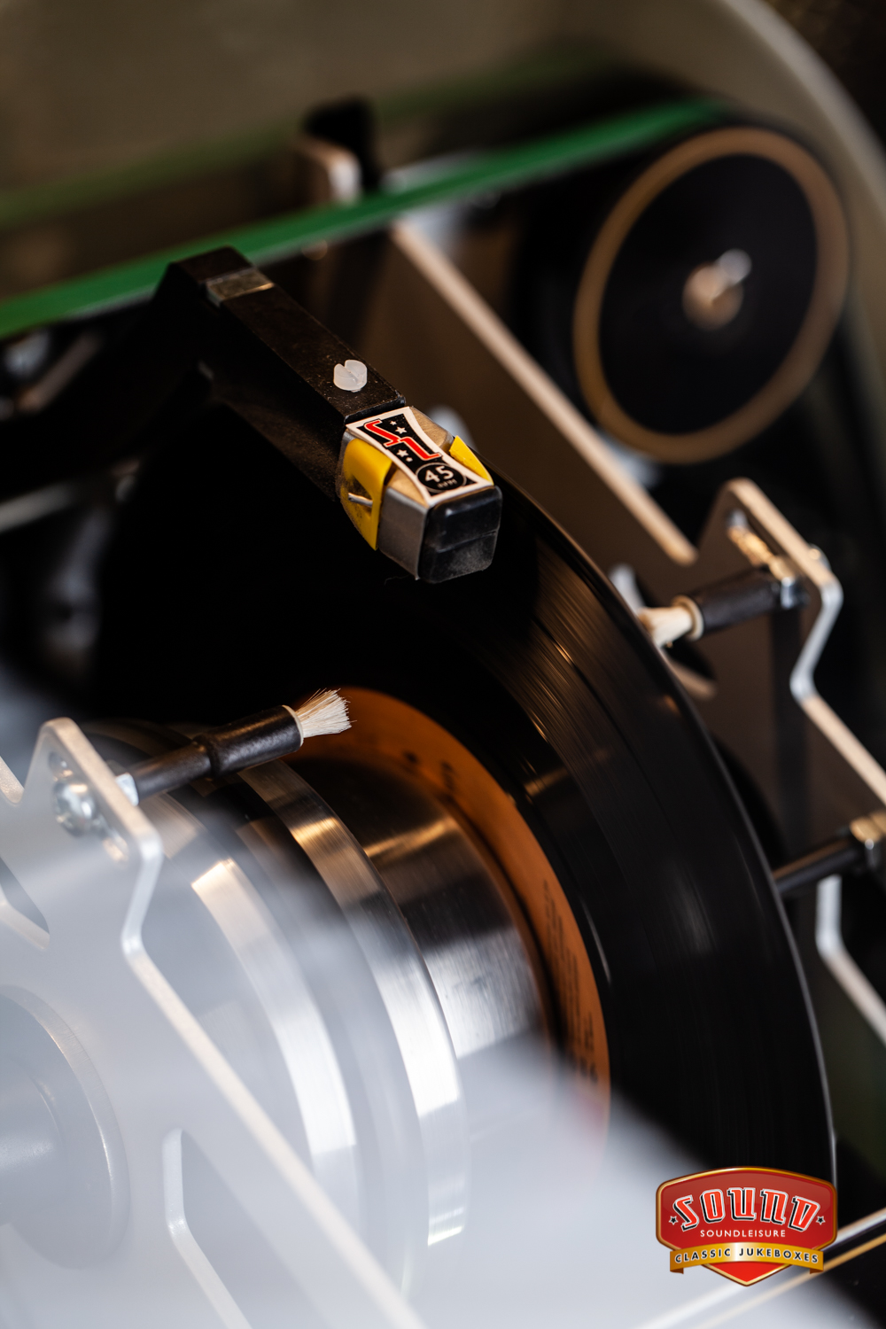 Le jukebox peut contenir 70 disques 7”, offrant 140 sélections en jouant les faces A et B.