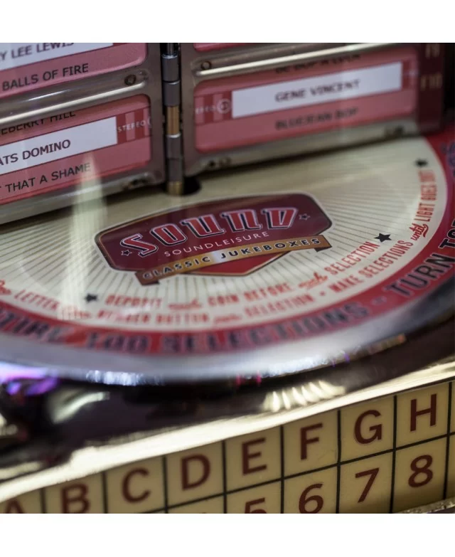 La consolette de jukebox Dime Box de Sound Leisure vous plonge directement dans l’ambiance des années 50, avec son design rétro emblématique qui rappelle l’âge d’or de la musique et des diners américains.