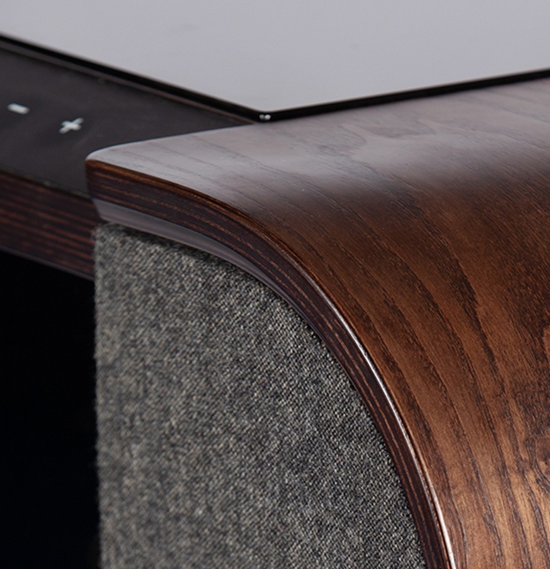 Les grilles des haut-parleurs magnétiques sont amovibles, interchangeables et fabriquées en sergé de laine 100%, provenant de sources locales de haute qualité.