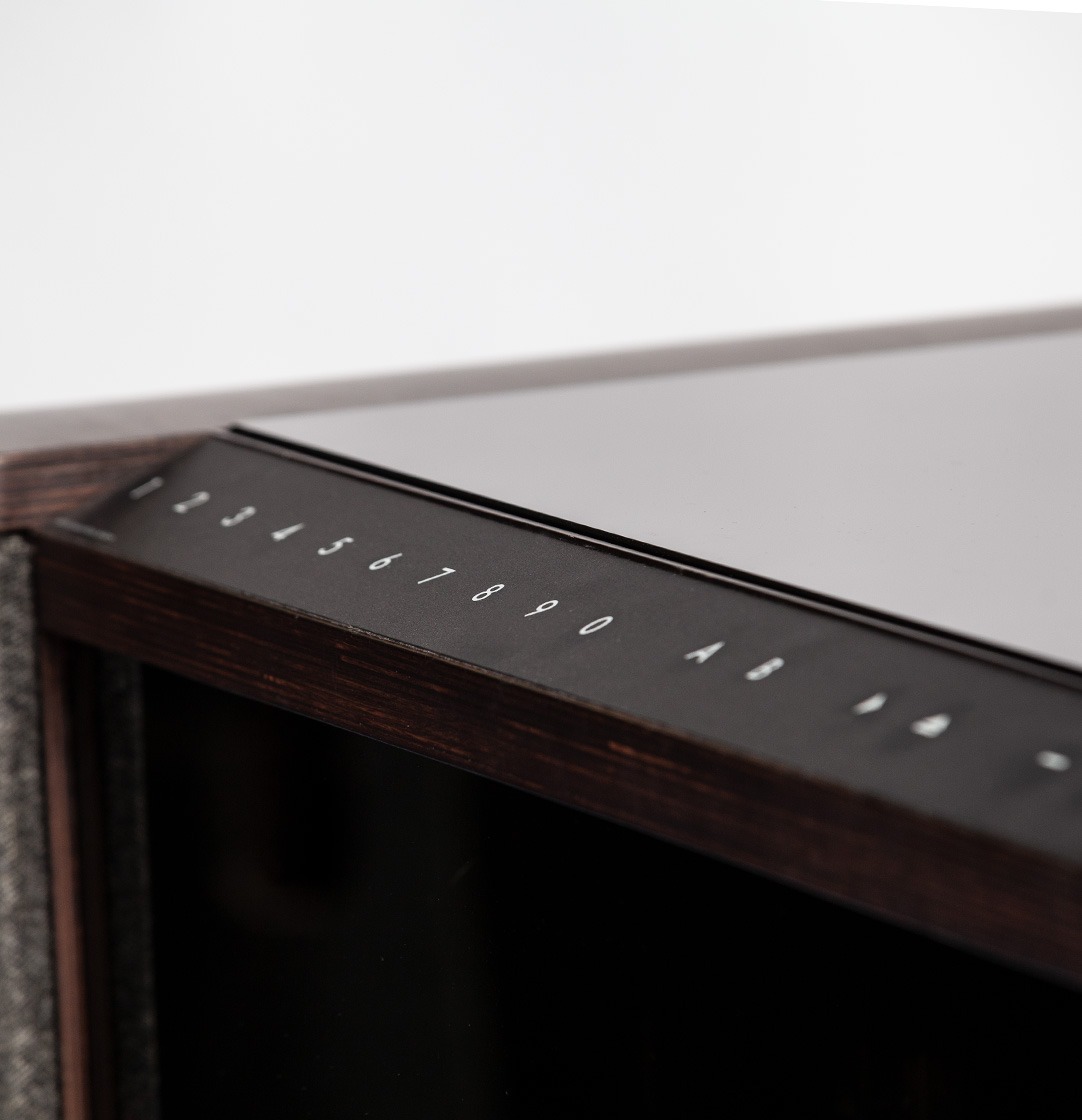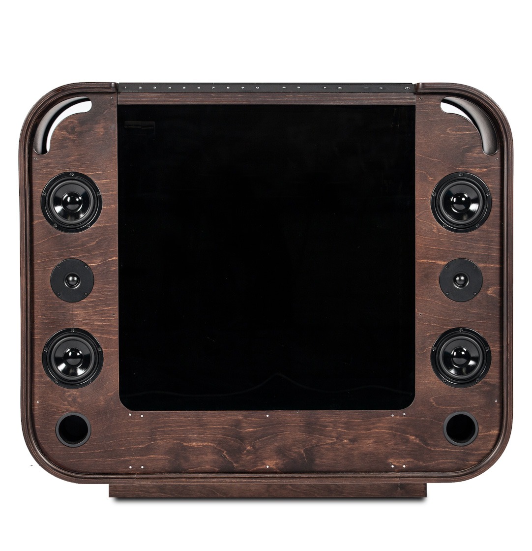 Au cœur du meuble se trouve notre mécanisme auto-changer VLP-20 breveté avec technologie “AutoFlip”, associé à notre amplificateur exclusif D3 et un système de haut-parleurs sur mesure, réglé sur 6 voies, comprenant 4 haut-parleurs (bass/mid-range) à port, ainsi que 2 tweeters intégrés dans le meuble.