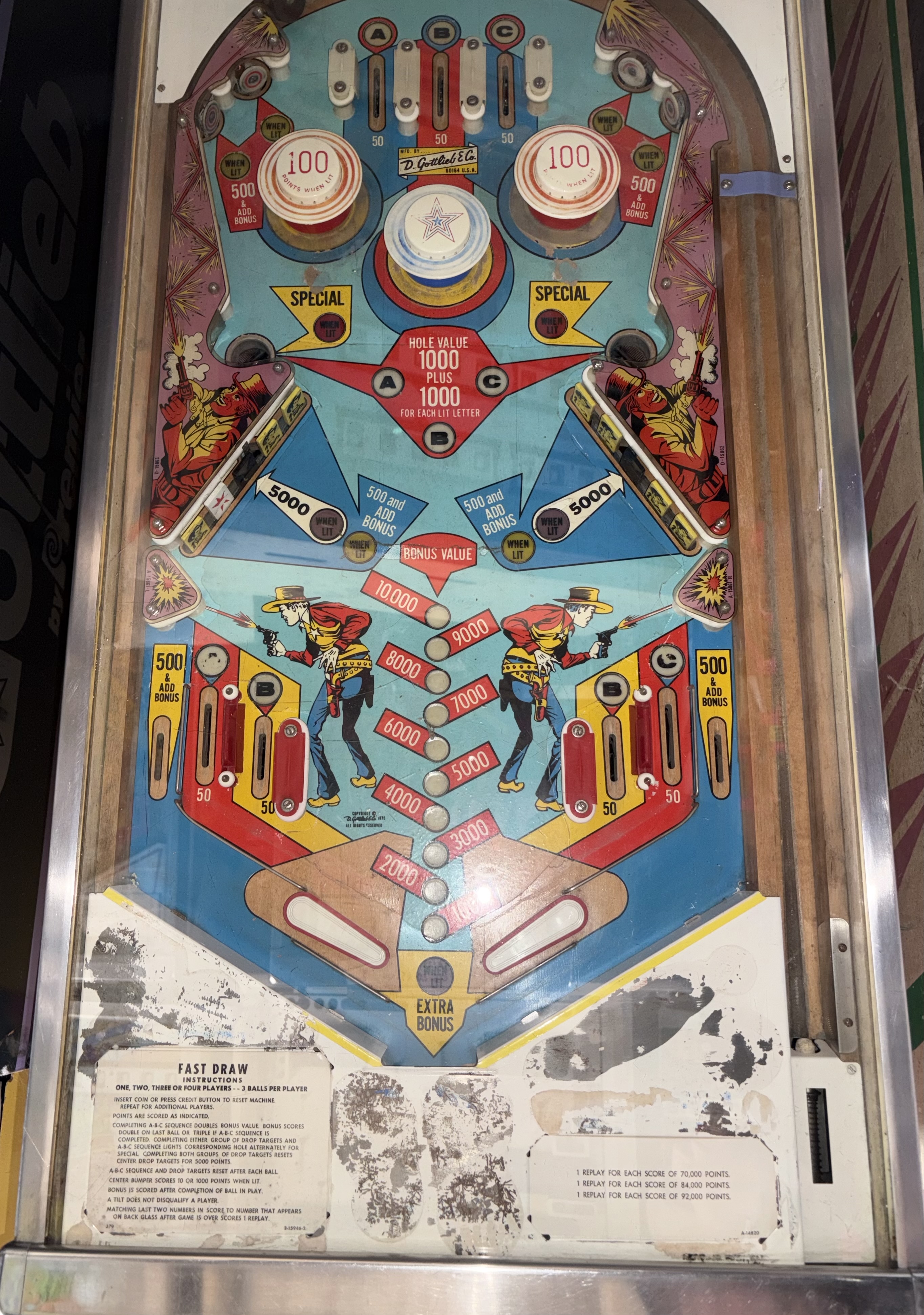 Sorti en avril 1975, le Fast Draw est un flipper électromécanique signé D. Gottlieb & Company, l’un des fabricants les plus emblématiques de l’âge d’or du flipper.